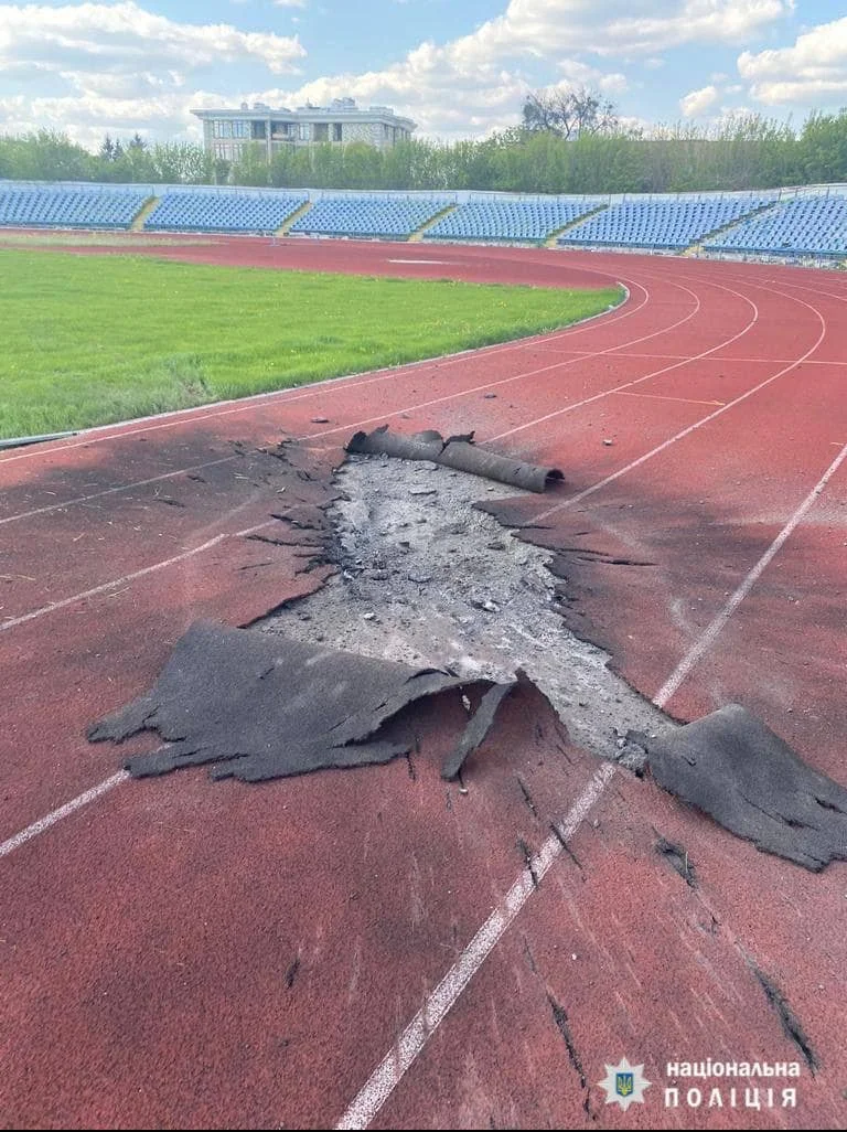 На фото, которые к своему посту приобщил автор, видно, что разрушена одна из трибун, повреждены газон и беговые дорожки.