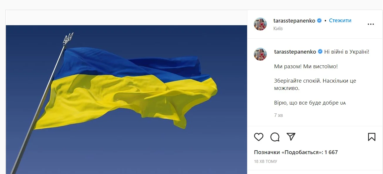 Футболист в своем Инстаграм опубликовал пост: "Нет войне в Украине! Мы вместе! Мы выстоим! Сохраняйте спокойствие. Насколько это возможно. Верю, что все будет хорошо".