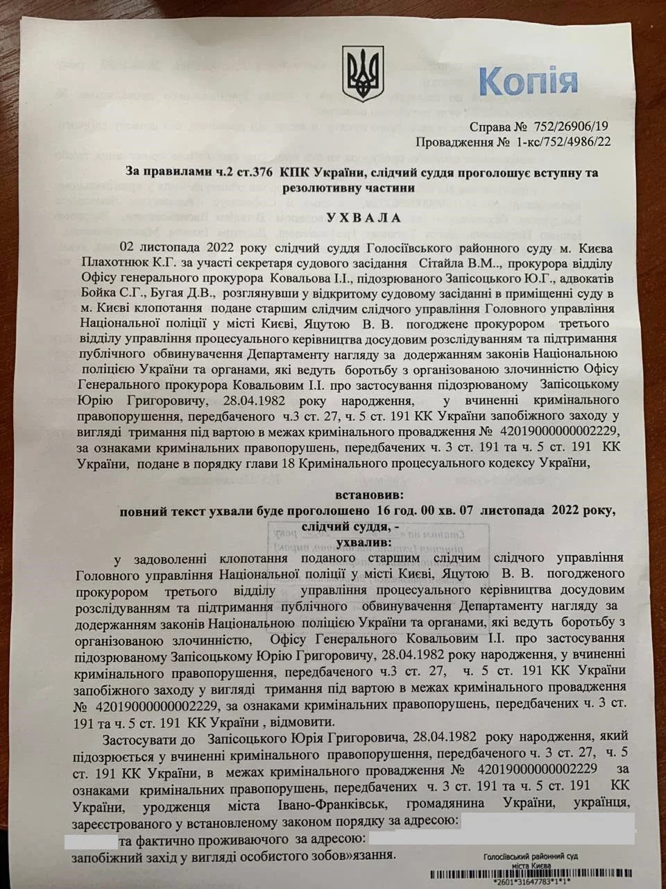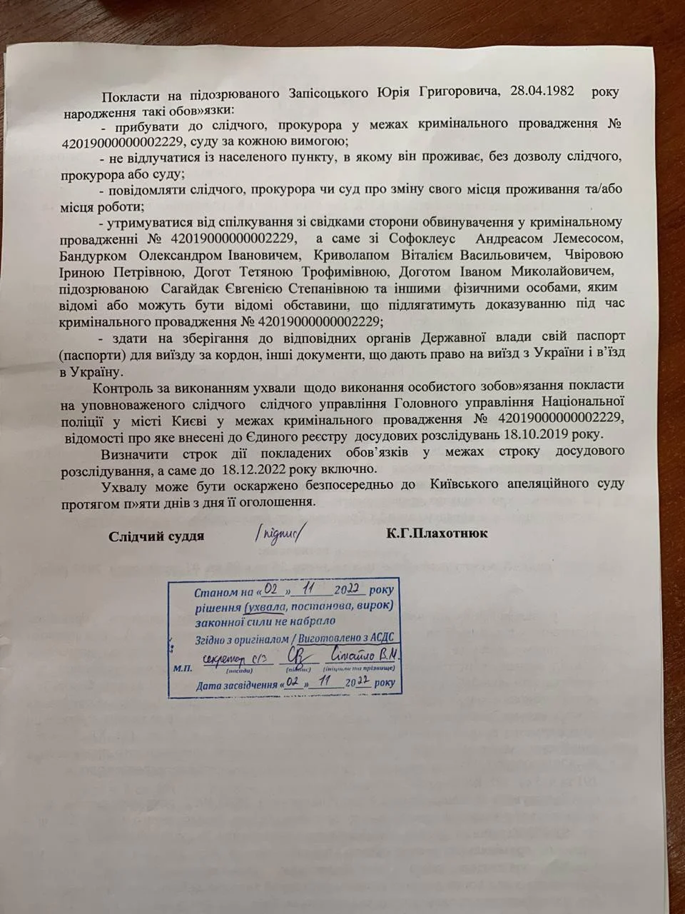 Голосеевский суд рассматривал дело в течение 2 дней и в конце концов вынес решение о личном обязательстве Юрия Записоцкого, подтвердив тем самым законность и обоснованность подозрения. Генсеку УАФ постановили: 1) не отлучаться из населенного пункта, где он проживает, без разрешения следователя, прокурора или суда; 2) сообщать об изменении своего места жительства или работы; 3) сдать на хранение органам власти загранпаспорт и другие документы, дающие право на выезд из Украины. Источник предоставляет образцы документов.