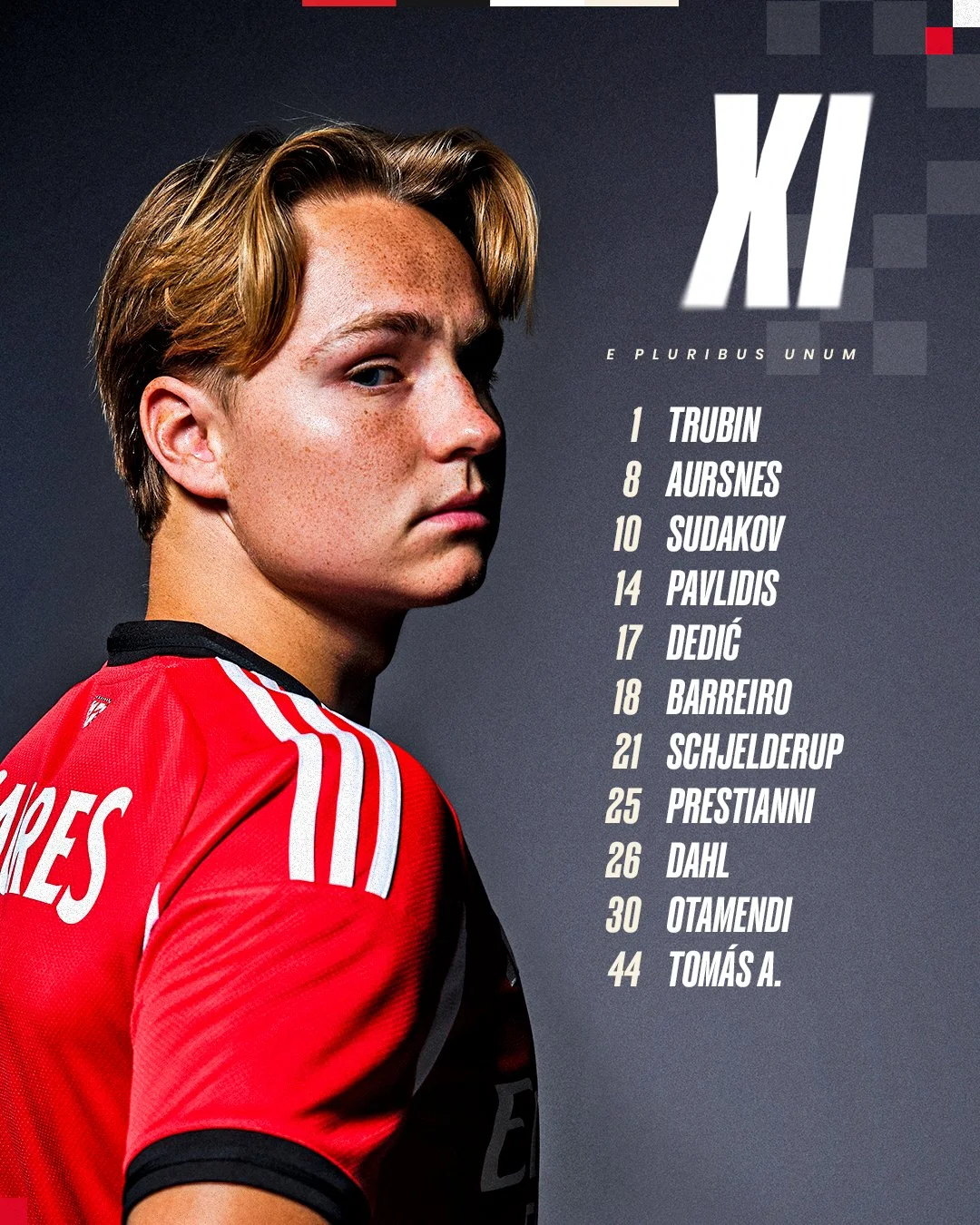 Стартовый состав Бенфики: Трубин – Дедич, Томас Араужу, Отаменди, Даль – Аурснес, Шельдруп – Престианни, Баррейро, Судаков – Павлидис.
