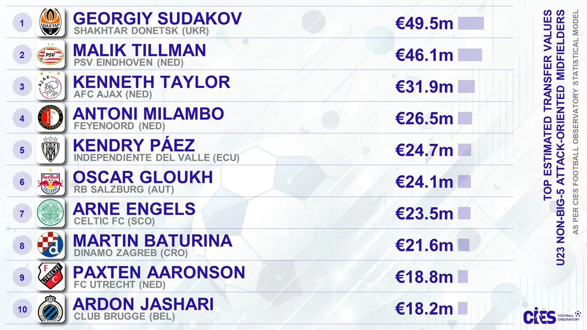 Полузащитник Шахтер Георгий Судаков возглавил десятку самых дорогих атакующе-ориентированных полузащитников мира в возрасте до 23 лет вне топ-5 чемпионатов, сообщает CIES.