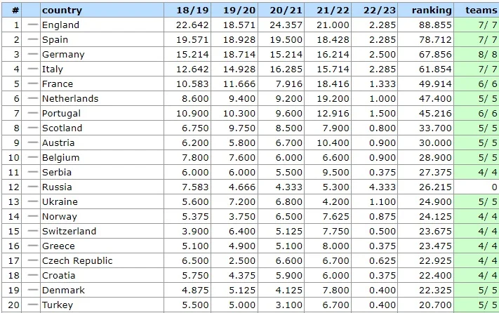 Для того чтобы иметь шансы напрямую делегировать чемпиона Украины в групповой турнир ЛЧ 2024/25, по итогам текущего сезона нужно занять хотя бы 11 место (10 позиция уже гарантирует прямую путевку). В настоящее время отставание Украины от Сербии, имеющей четырех представителей в еврокубках (соответственно, все ее очки делятся на 4) составляет более двух баллов (2,475, если быть точным).