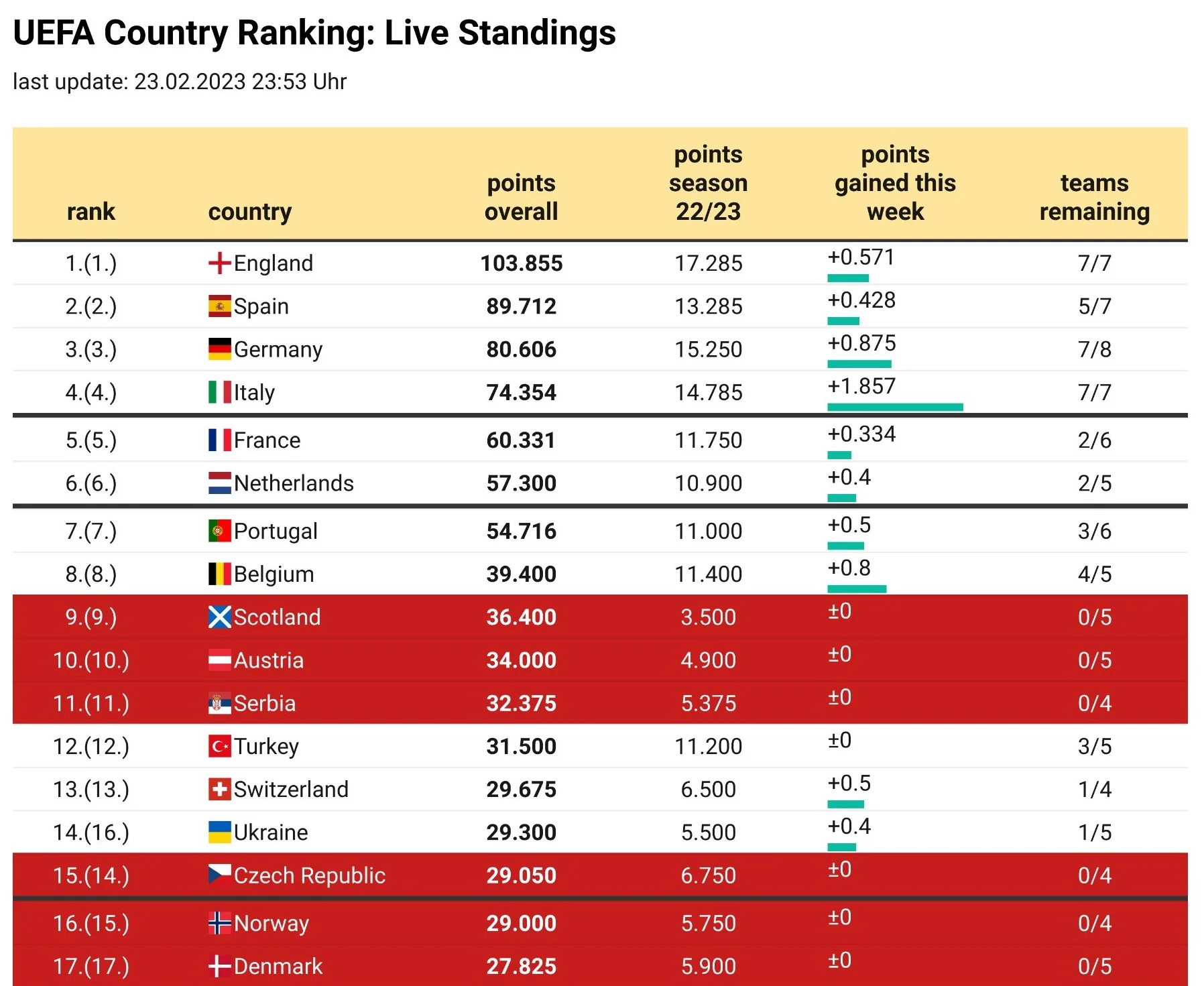 Правда, 13 место абсолютно ничем не отличается от 14. Существенное улучшение даст 12 место, но добраться до Турции почти не реально. Турки имеют 2,2 очка отрыва, а три команды продолжают борьбу в еврокубках.