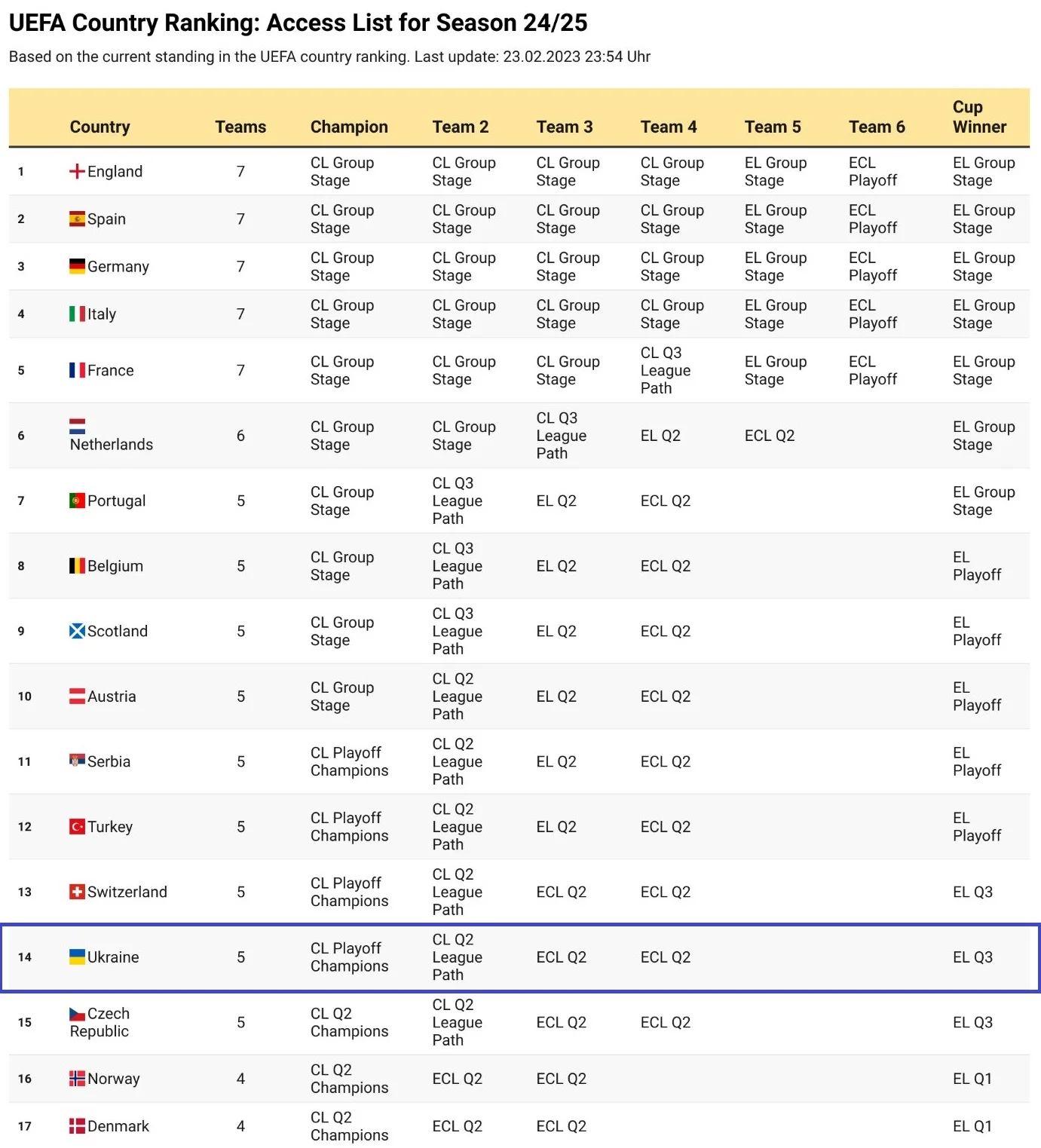 Наши клубы выполнили главную задачу – залетели в топ-15. Это гарантирует две команды в квалификации Лиги чемпионов и сохранение квоты 5 представителей. 14 место еще слаще, ведь чемпиону Украины 2023/24 придется проходить на один раунд отбора Лиги чемпионов меньше – старт из плей-офф квалификации.