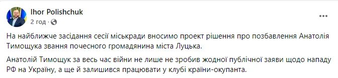 Анатолий Тимощук за всё время войны не только не сделал ни одного публичного заявления о нападении РФ на Украину, но и остался работать в клубе страны-оккупанта", – написал мэр Луцка Игорь Полищук на своей странице в социальной сети Facebook.