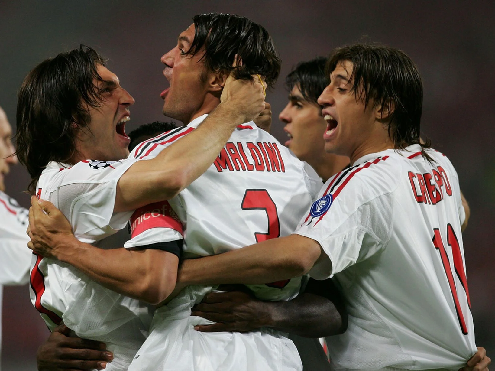 Мальдини в объятиях партнеров после гола Ливерпулю на 1-й минуте финала ЛЧ