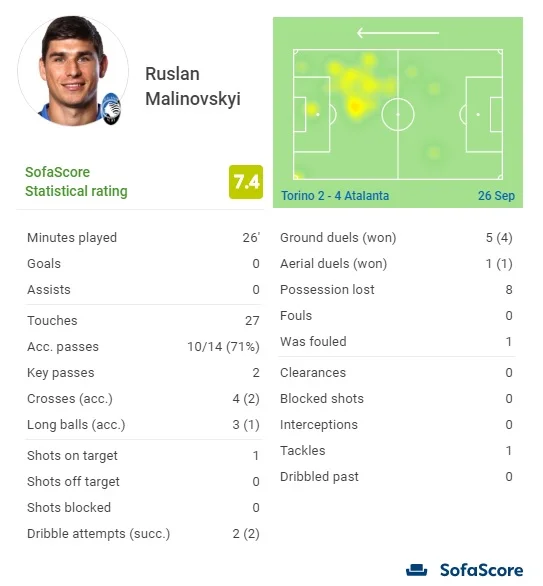 Наставник Аталанты выделил для хавбека сборной Украины лишь 26 минут (без учета компенсированного времени). Малиновский довольно активно вошел в игру, особенно запомнившись в первые минуты после появления на поле. Партнеры регулярно искали именно Руслана, который постоянно получал мяч и в определенный отрезок игры был самым активным на поле. К сожалению, где-то именно в это время Аталанта отошла к собственным воротам, больше сосредоточившись на содержании приемлемого для себя счета. Как следствие, у Малиновского не было много шансов продемонстрировать свои способности в атакующих действиях.