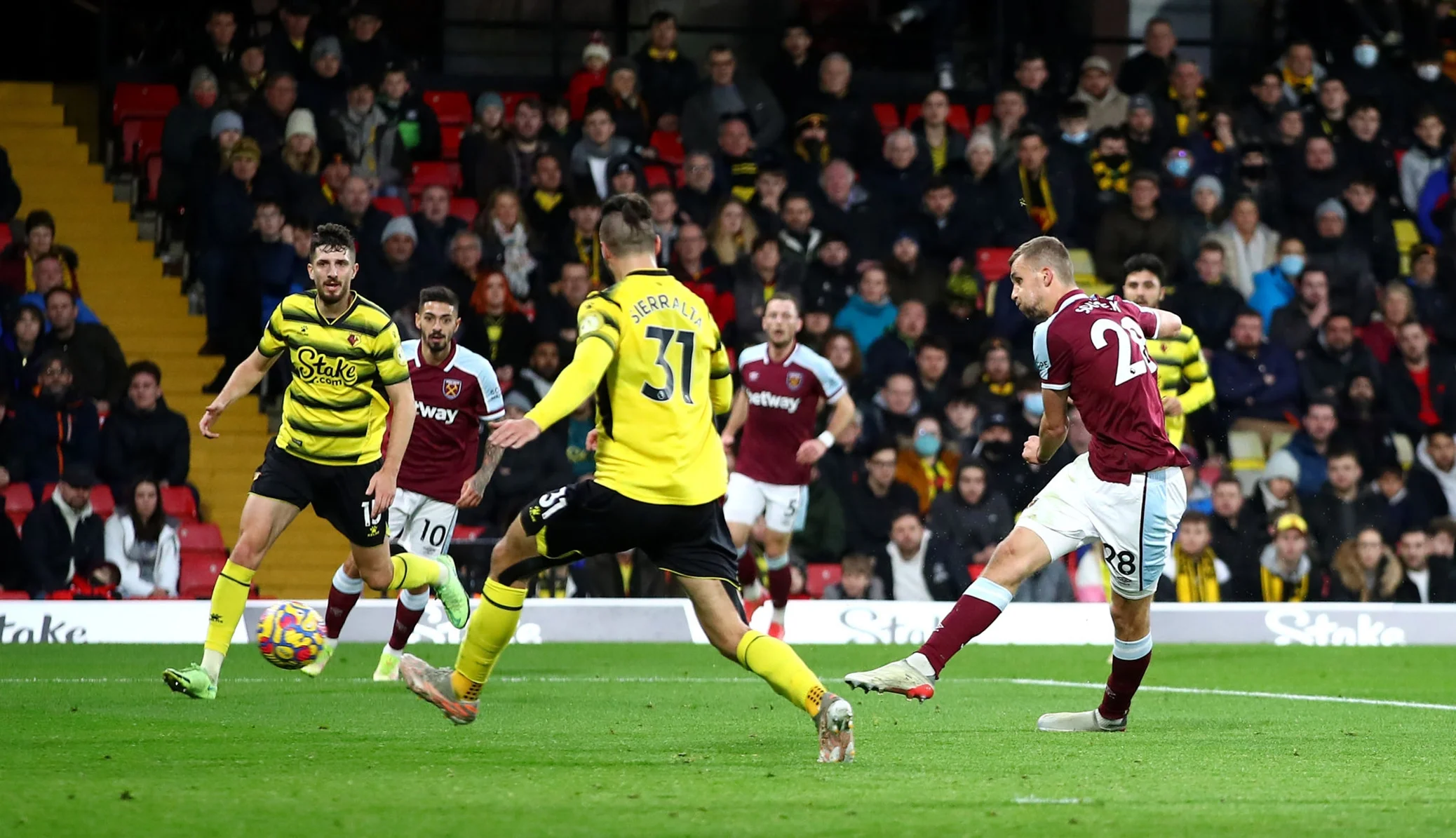 В параллельном матче Уотфорд принимал Вест Хэм, снова начавший поединок без Ярмоленко (Андрей остался в запасе). Лондонцы держались в 7 очках от зоны ЛЧ, так что допускать осечку они не имели права – впрочем, уже на 4-й минуте гости пропустили вследствие вбегания Бонавентуре в штрафную. 1:0!