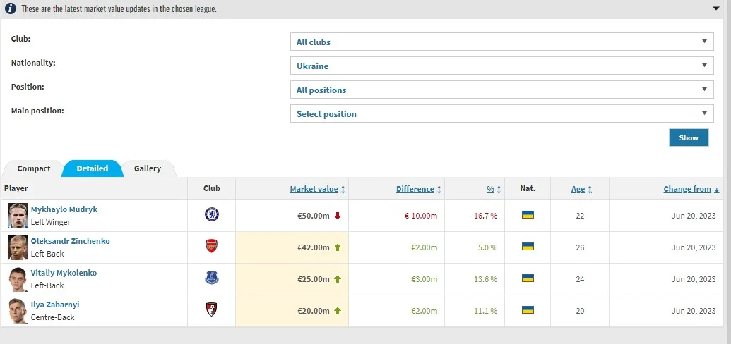 Не оправдал возложенных на него надежд Михаил Мудрик. Вингер Челси подешевел на 16,7% и стоит теперь 50 млн евро. Полузащитник Арсенала Александр Зинченко подорожал на 4% и стоит 42 миллиона. Выросли в цене и украинские защитники: Виталий Миколенко из Эвертона прибавил 13,6% и стоит 25 млн, а Илья Забарный из Борнмута – 11,1% и 20 млн соответственно.