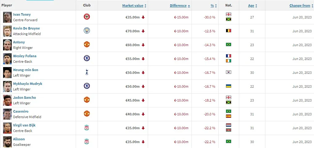 Интересно, что "падение" Мудрика не стало каким-то исключением – столько же в процентном значении потерял и форвард Тоттенхэма Хын Мин Сон. В компанию к ним попали также Кевин де Брюйне (Манчестер Сит), Антони (Манчестер Юнайтед) и Уэсли Фофана (Челси). Больше всего же пострадала репутация нападающего Брентфорда Айвена Тоуни – его цена упала сразу на 30% (15 млн) и составляет теперь 35 миллионов евро.