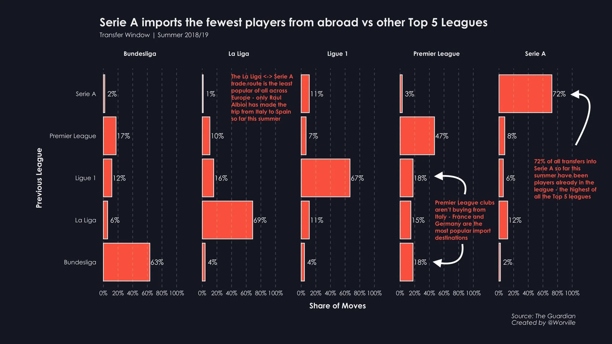 – Итальянский рынок наиболее замкнутый в себе. Клубы Серии А 72% трансферов проворачивают внутри лиги. Другие топ-чемпионаты не слишком заинтересованы в приобретениях из Италии. Как вариант объяснения – местные гранды возглавляют итальянские тренеры, которые прекрасно знакомы с лучшими местными исполнителями и хантят их.