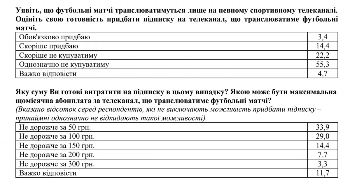 77,5% украинцев не будут покупать или, скорее не будут покупать подписку на футбольные матчи на спортивных телеканалах, даже если матчи будут транслироваться только там. Такие данные были получены Украинской социологической группой после опроса, проведенного с 8 по 12 июля на подконтрольных Украине территориях.