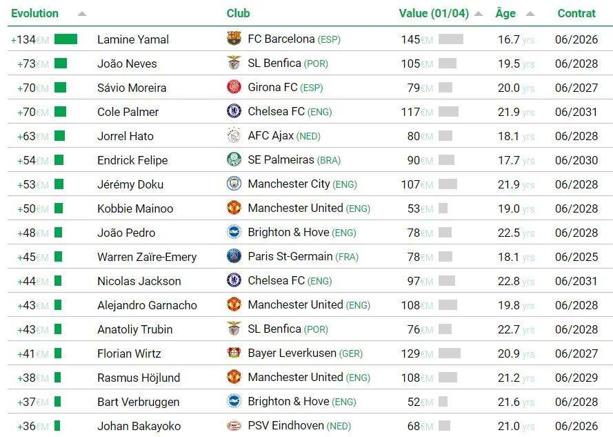 На вершине никому не оставил шансов Ламин Ямал. Талант Барселоны за полгода прибавил аж 134 млн и теперь стоит заоблачных 145 млн.