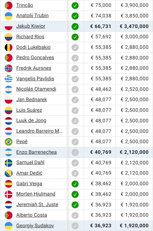 Трубин уступает лишь вингеру Франсишку Тринкау, который в Спортинге зарабатывает 3,9 млн евро в год. А вот Георгий Судаков расположился аж на 22-м месте, получая вдвое меньше Трубина – 1,92 млн евро.