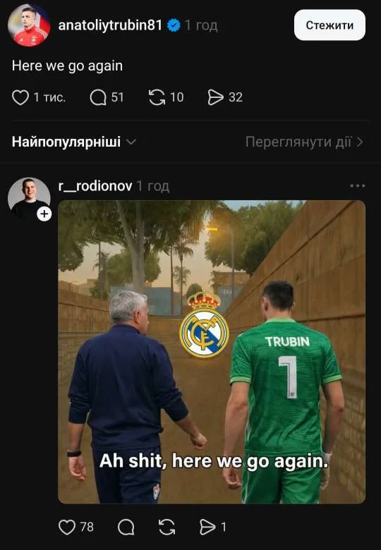 Эти слова отсылают к культовой фразе из видеоигры GTA San Andreas, которая стала мемом. В комментариях поклонники продолжили шутить и даже прифотошопили Трубина с Моуринью на скрин из игры.