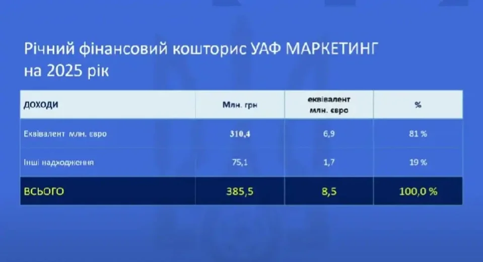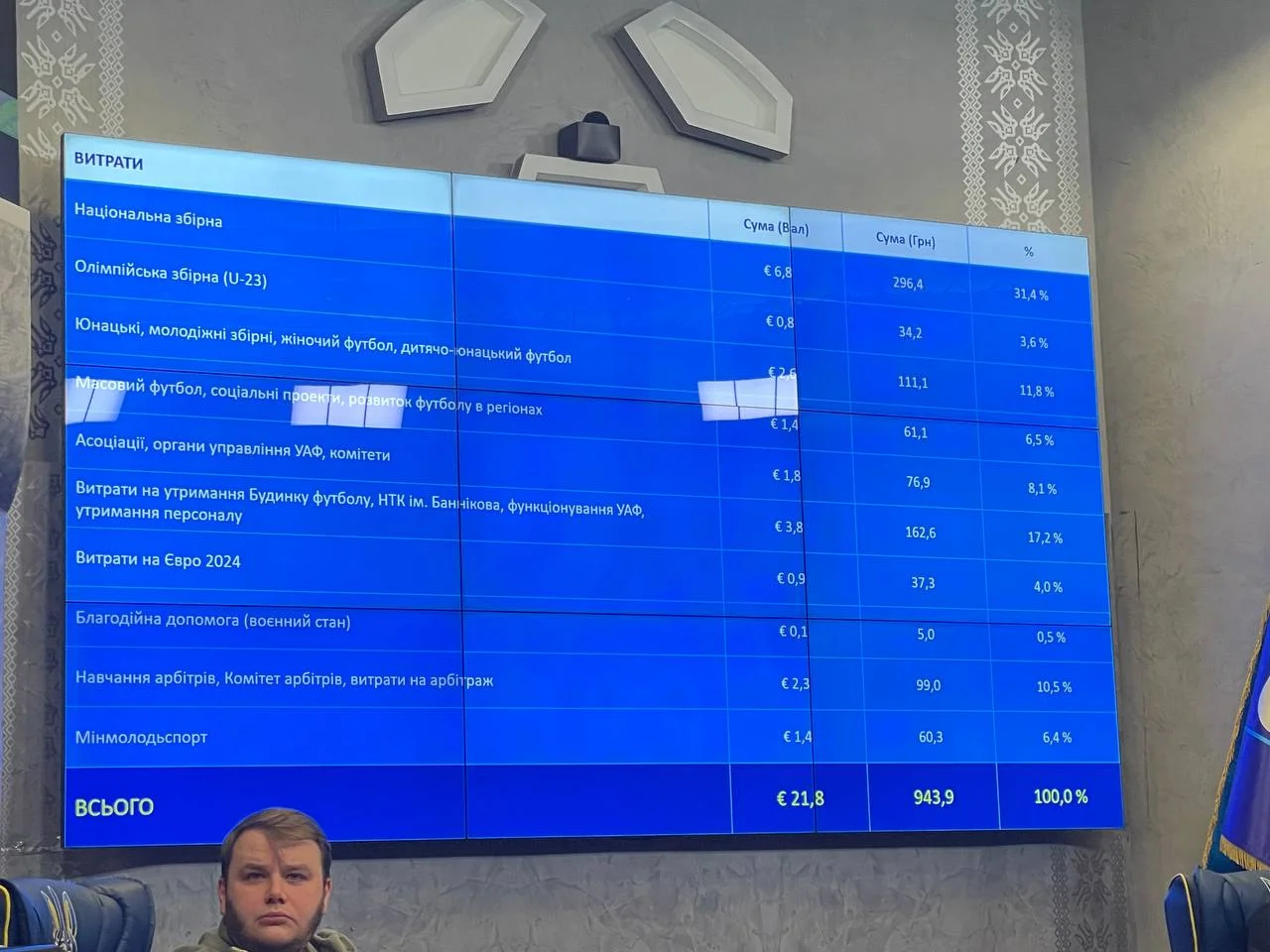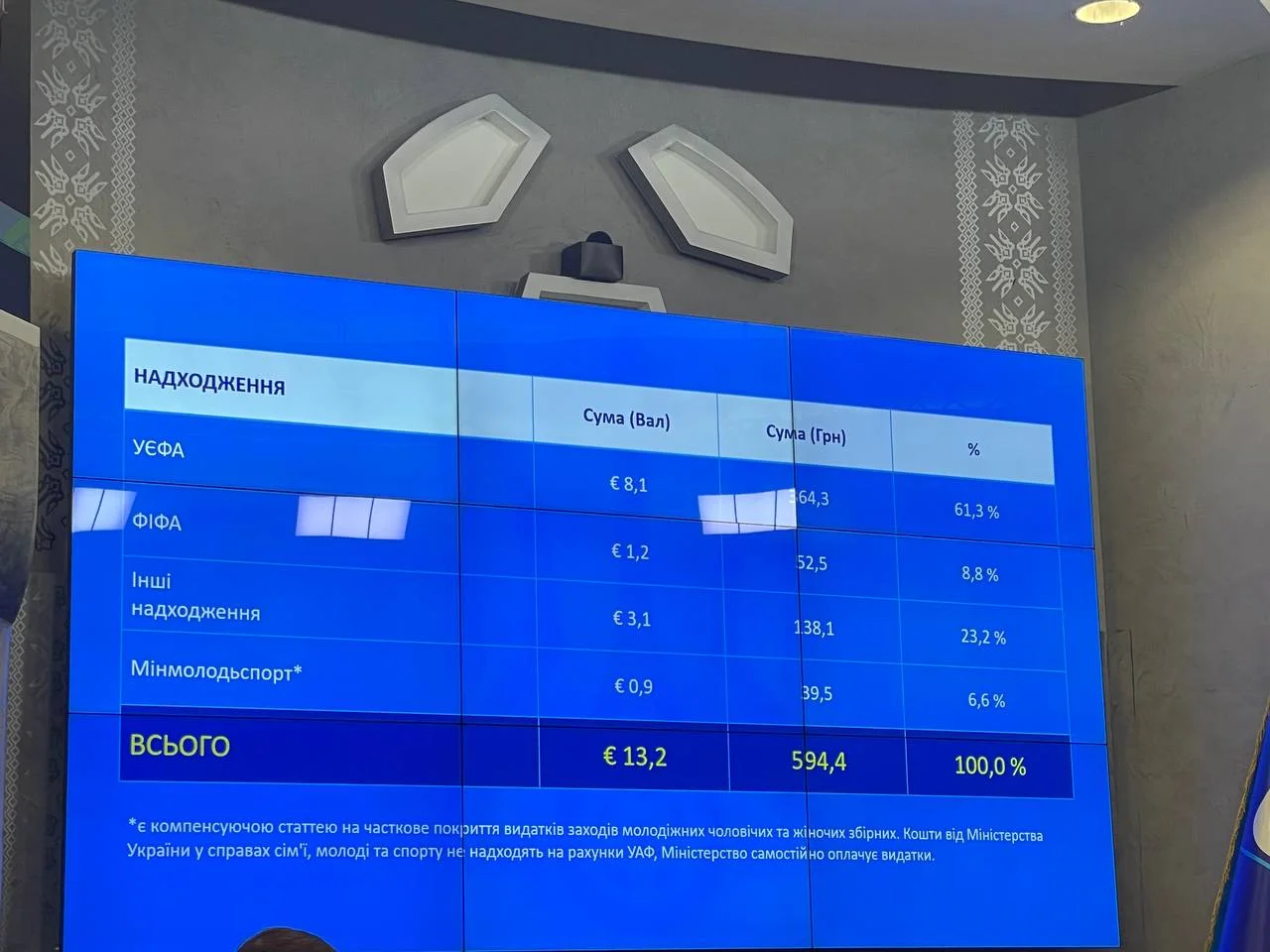Так, расходы за 2024 год составили 943,9 млн грн (21,8 млн евро). Финансовые поступления же составили 594,4 млн грн (13,2 млн евро). А финансовая смета УАФ на 2025 год составила 385,5 млн гривен.