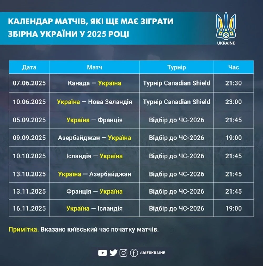 Осенью сборная Украины начнет отбор на ЧМ-2026, где соперниками "сине-желтых" будут команды Франции, Азербайджана и Исландии. Следующий свой матч сборная Украины сыграет 7 июня на турнире Canadian Shield против команды Канады.