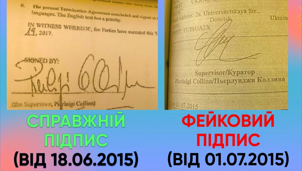 На заседании этот факт подтвердил и Владимир Генинсон, который якобы подписывал документ со стороны ФФУ. Бывший исполнительный директор организации сегодня заявил, что он никогда его не подписывал и добавил, что часто видел подписи Коллины. Генинсон может подтвердить, что в документе от 1 июля 2015 года не подпись итальянца.