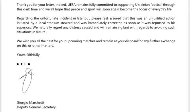 Что касается досадного случая в Стамбуле, то, пожалуйста, будьте уверены: это была неправомерная, необоснованная инициатива одного из стюардов местного стадиона, которая была мгновенно прекращена после того, как о ней стало известно его руководителям. Конечно, мы сожалеем о тех болезненных ощущениях, которые причинил вам данный эпизод, и сделаем все возможное, чтобы предотвратить подобные случаи в будущем", – написал заместитель генерального секретаря УЕФА Джорджио Маркетти в письме УАФ.