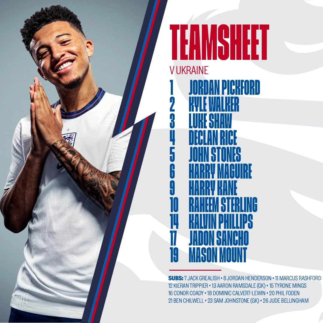 Англия: Пикфорд – Уокер, Стоунз, Магуайр, Шоу – Филлипс, Райс – Санчо, Маунт, Стерлинг – Кейн