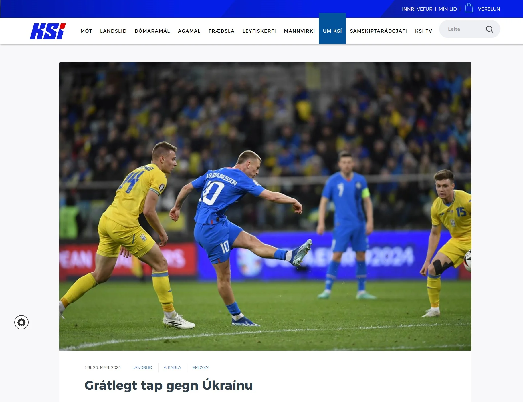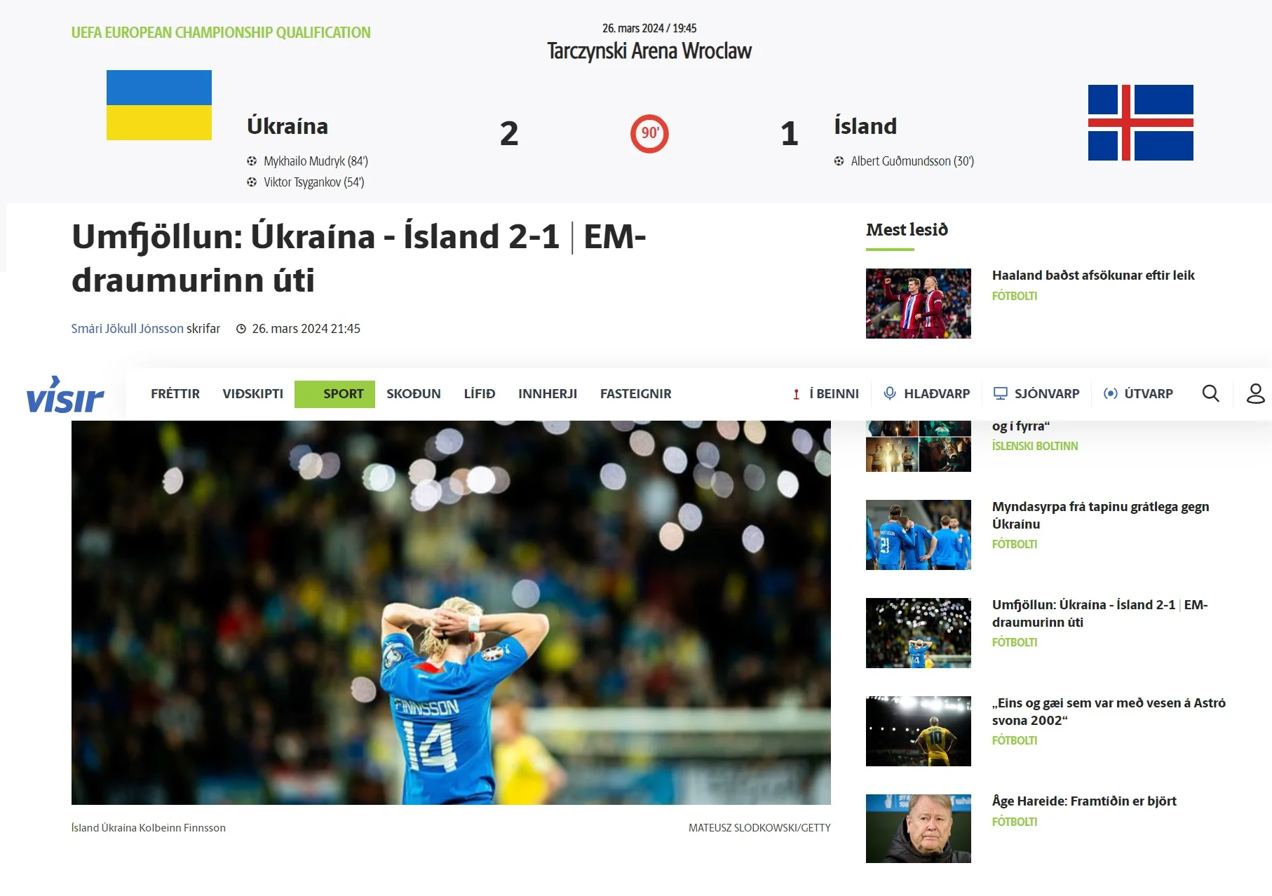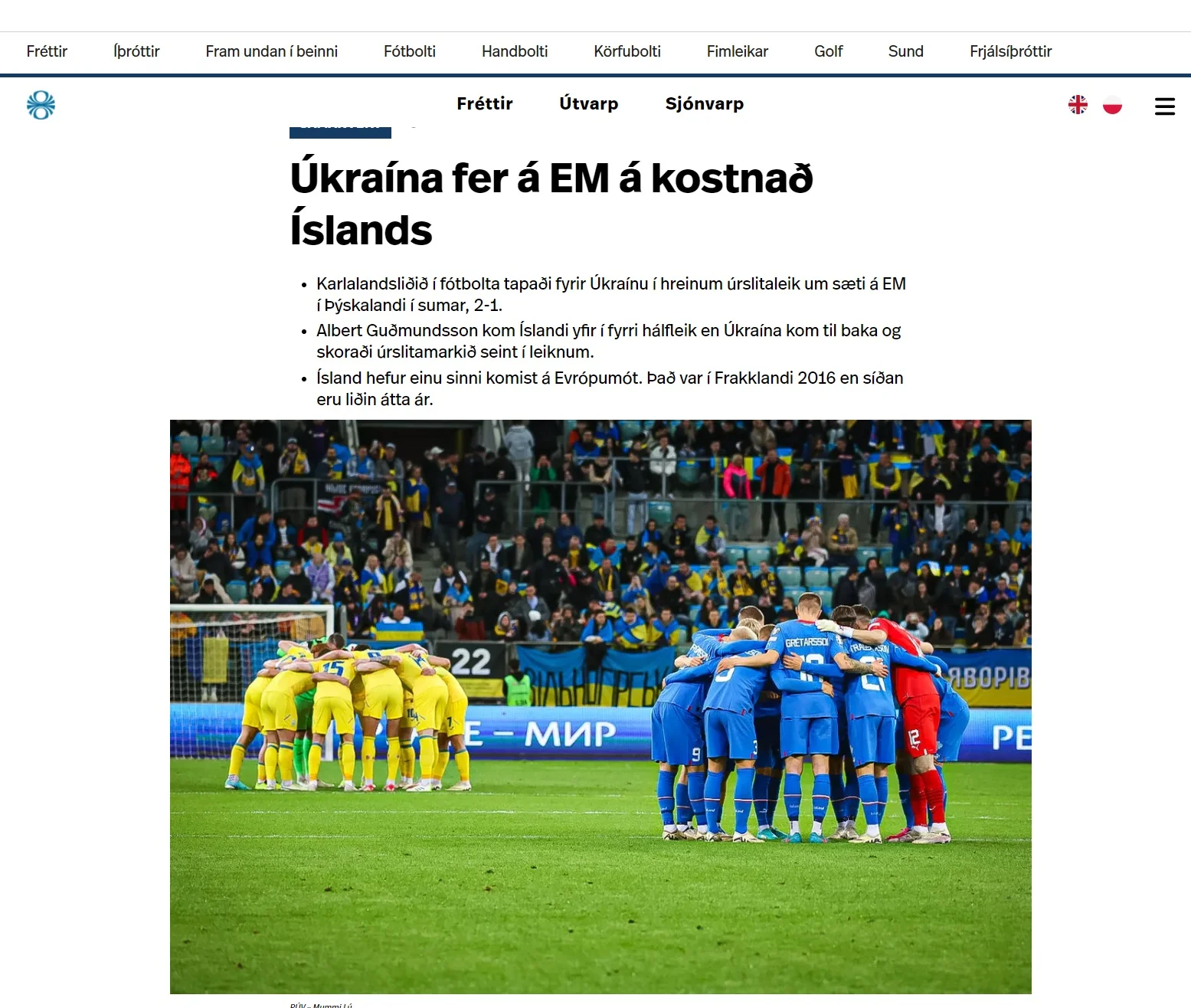 Мрія Ісландії про місце на чемпіонаті Європи у Німеччині розбилася сьогодні увечері у Вроцлаві. Україна перемогла, і вона буде серед учасників європейського турніру. Ця гра була набагато напруженішою, ніж проти Ізраїлю в Будапешті днями. На трибунах було багато українських уболівальників, але ісландську команду добре підбадьорювали кілька сотень ісландців, котрі підспівували, коли перед грою звучав державний гімн.