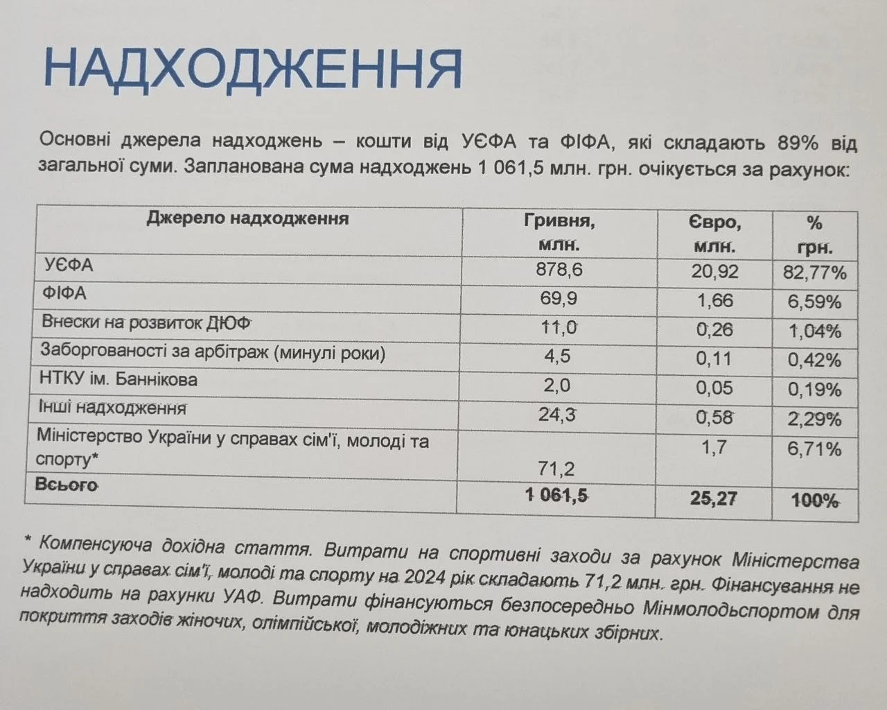 Основным источником доходов являются средства от УЕФА и ФИФА – они покрывают аж 89% из 25,27 млн евро запланированных поступлений на счета УАФ.