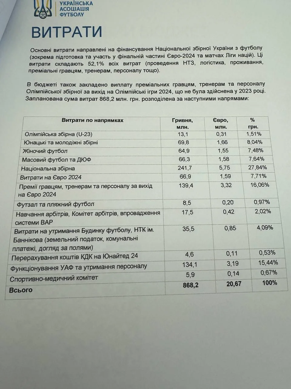 Руководство украинского футбола собирается потратить 20,67 млн евро. 52,1% от этих денег пойдут на финансирование Национальной сборной Украины по футболу. В бюджете также заложена выплата премий Олимпийской сборной за попадание в финальный турнир ОИ-2024 (0,31 млн евро) – она не была проведена в 2023 году. Таким образом, УАФ выполняет обещание предшественников.