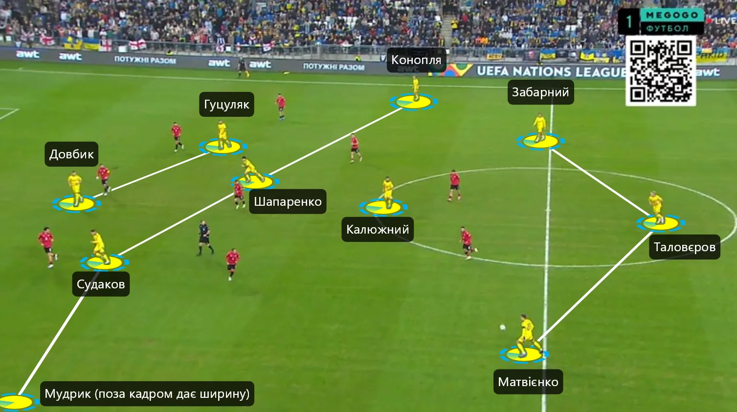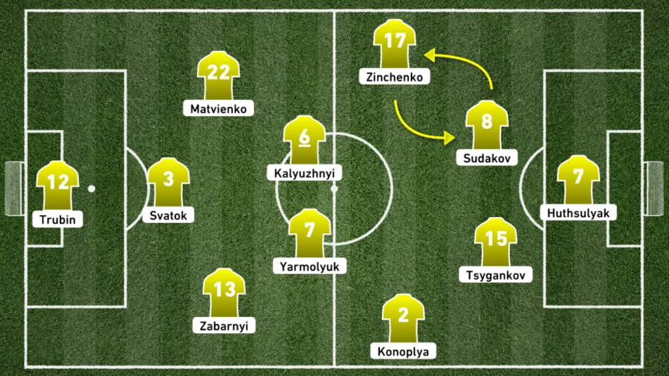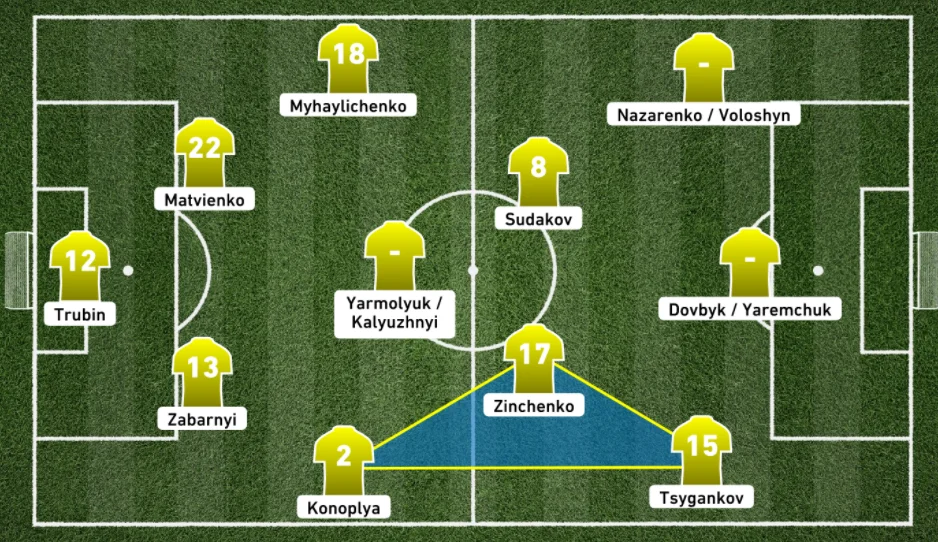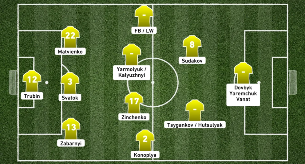 Украина: Трубин – Забарный, Сваток, Матвиенко – Конопля, Калюжный, Ярмолюк, Зинченко – Зубков, Судаков – Довбик