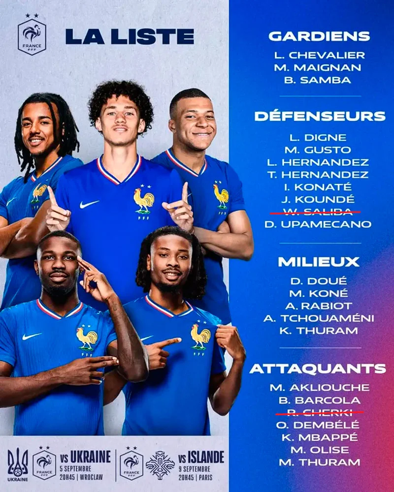 Франция: Меньян – Кунде, Конате, Упамекано, Динь – Чуамени, Коне – Дуэ, Олисе, Барколя – Мбаппе