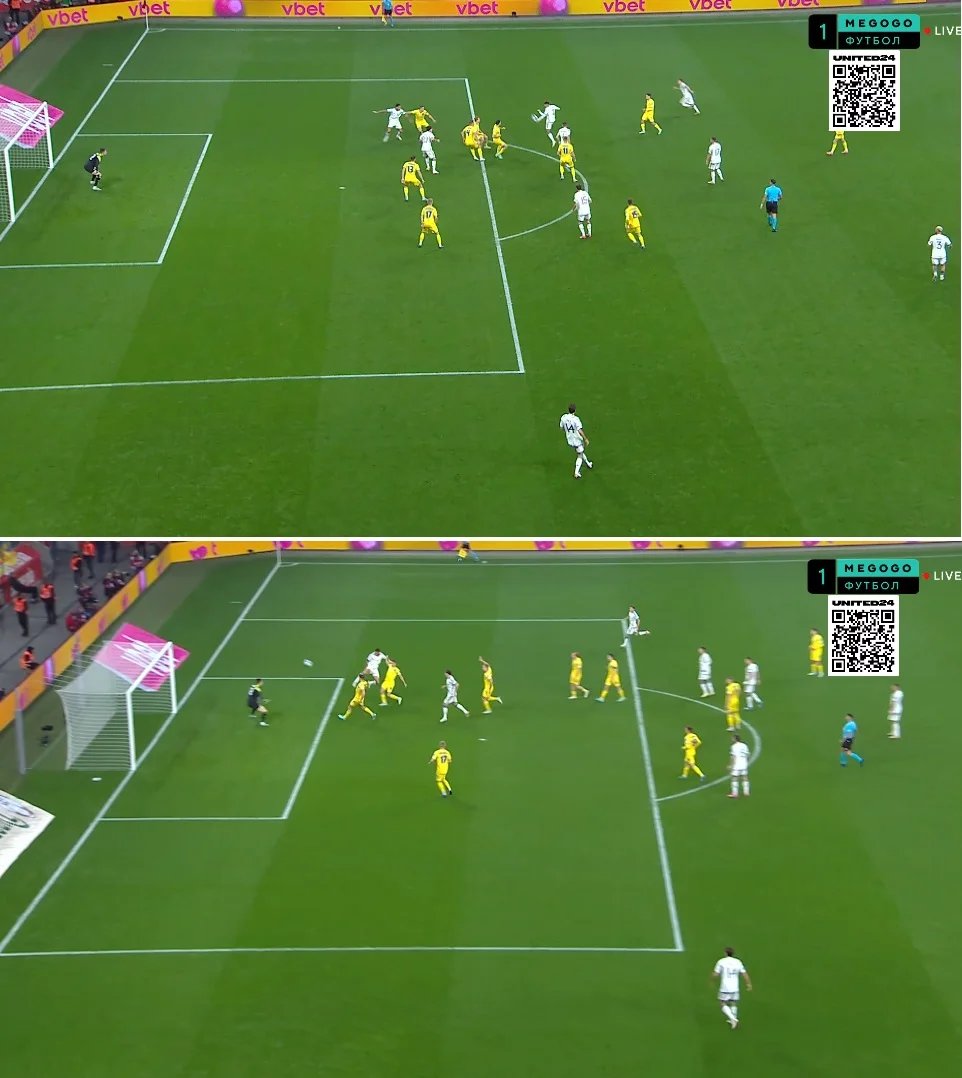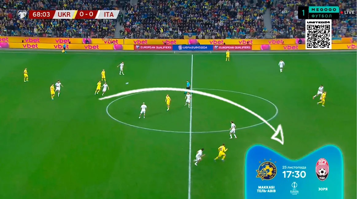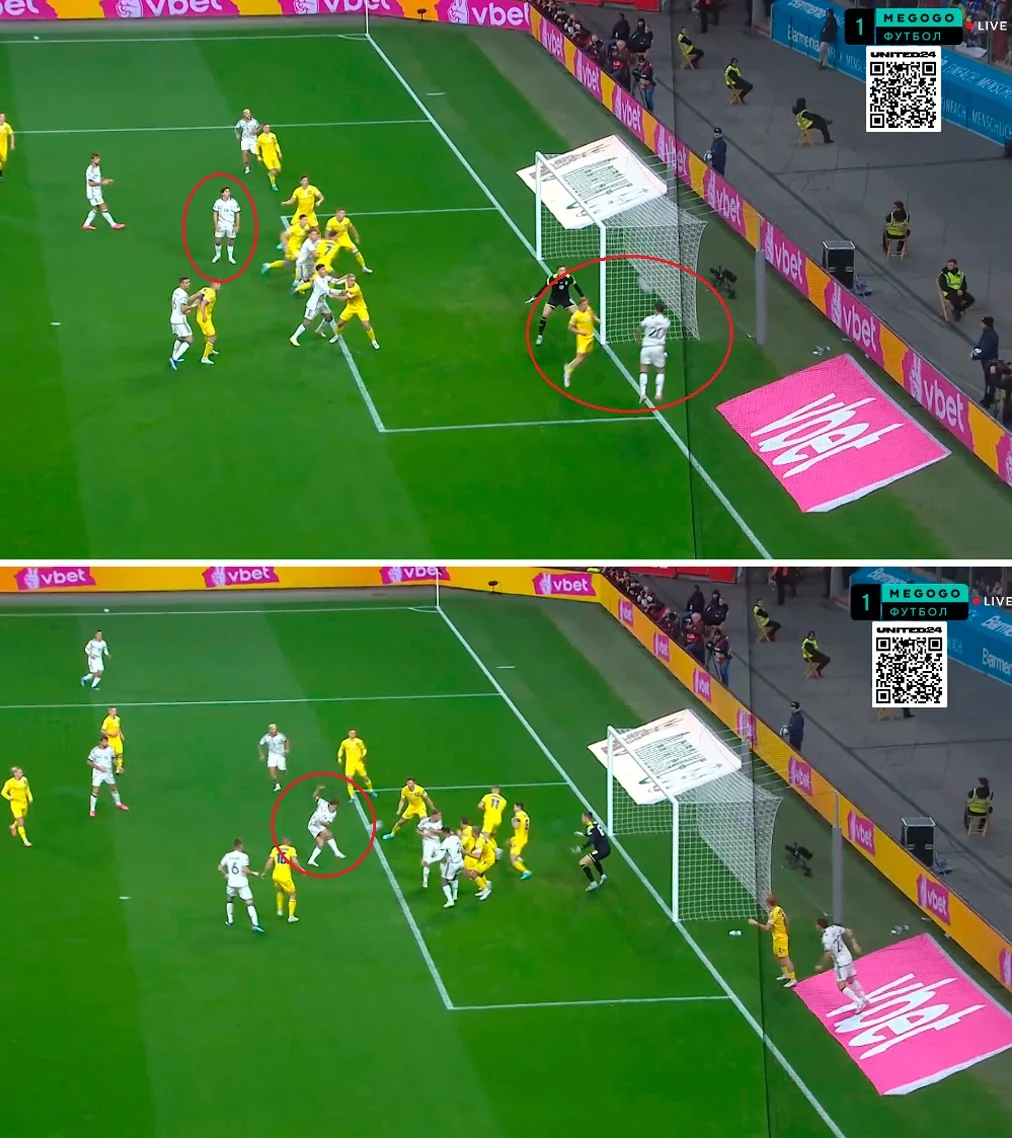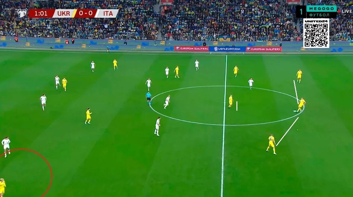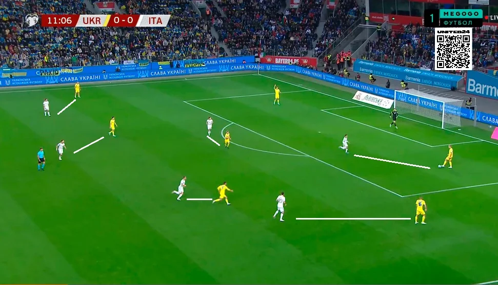 Данный ход позволил Миколенко не разрываться между помощью в центре защиты и игрой по Дзаньоло. Забегая вперед скажем, что существенных проблем с этого фланга Украина не получила. Кроме того, в этой модели было удобно контролировать попытки врыва центрхавов в штрафную.