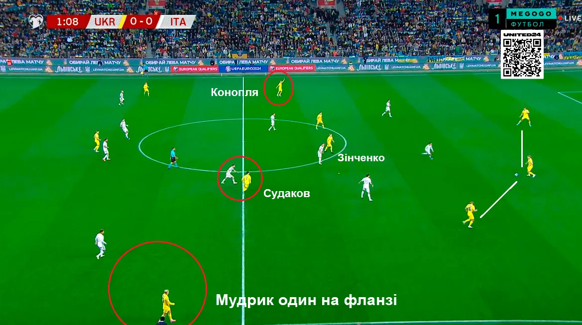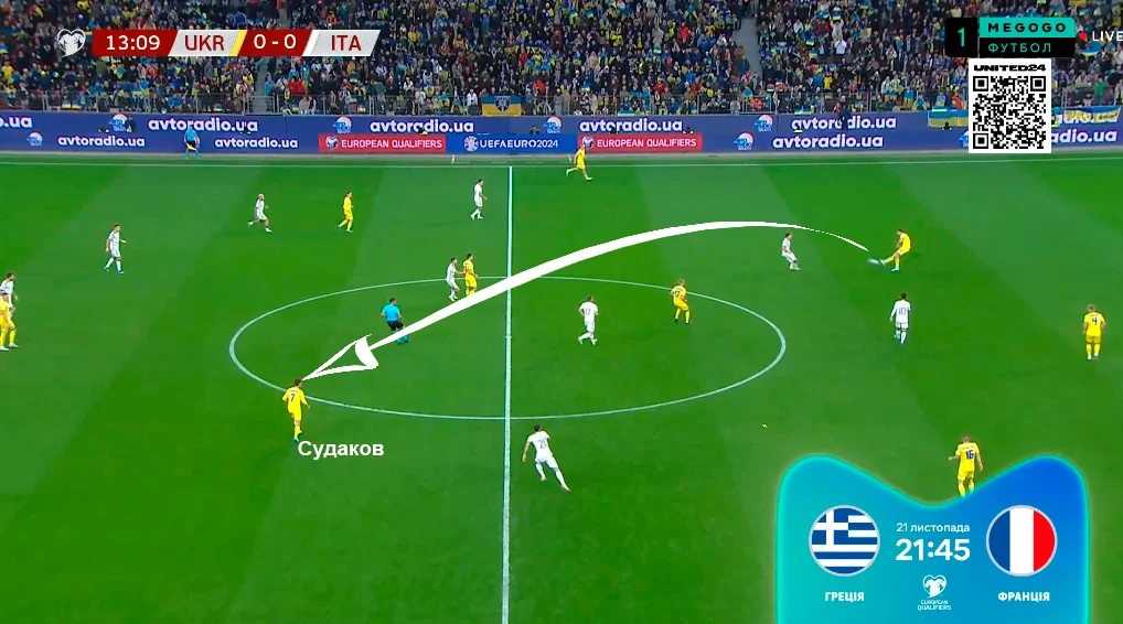 Были позитивные изменения и в билд-апе. Зинченко располагался в центре (часто ему помогал еще и Судаков), а Миколенко оставался в задней линии – таким образом, Мудрику никто не мешал разбегаться по флангу.