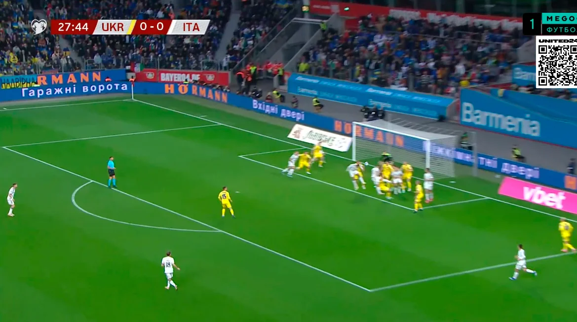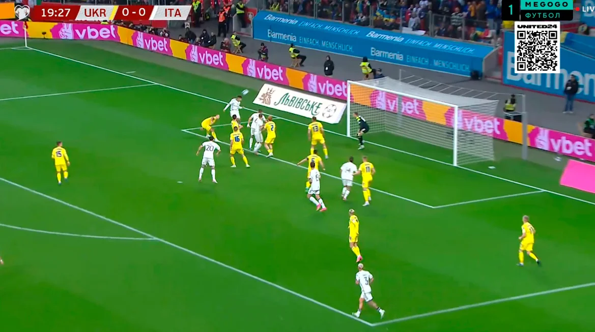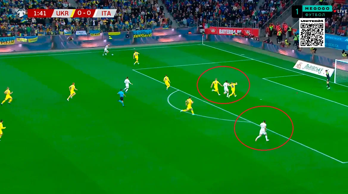 Миколенко и Сваток контролируют попытку врывания Распадори, хотя Италия максимально растягивает оборону Украины
