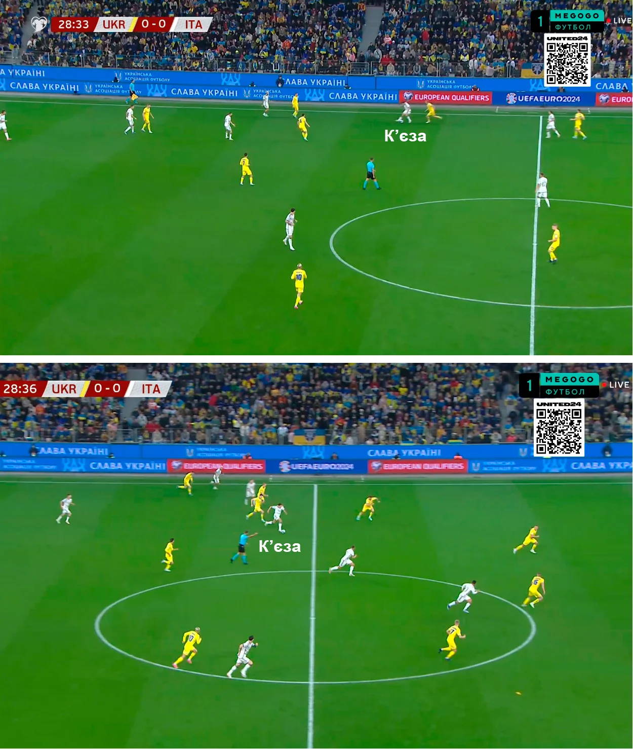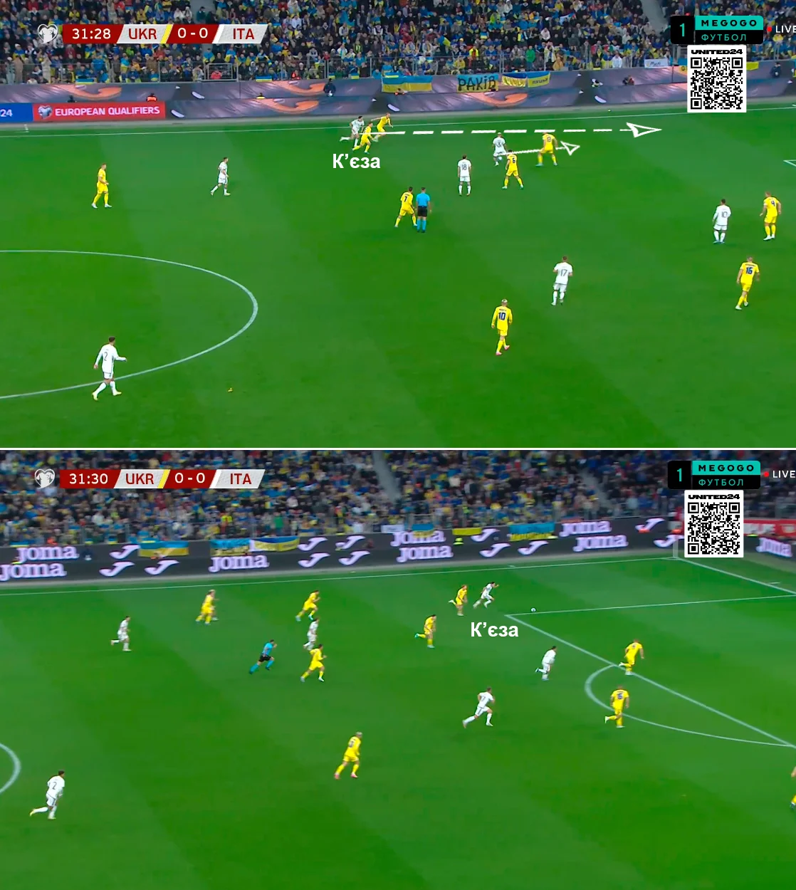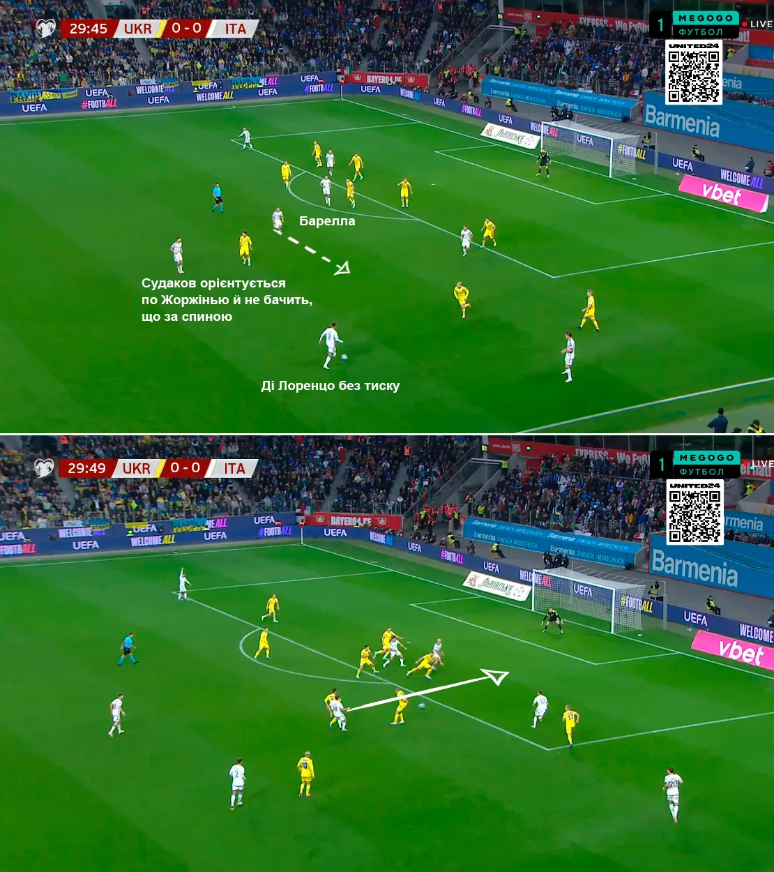 Италия на мяче желала перегружать нашу оборону. Без мяча же апеннинцы встречали высоко, интенсивно прессингуя. Тем не менее, украинская сборная довольно убедительно выходила из-под этого давления.