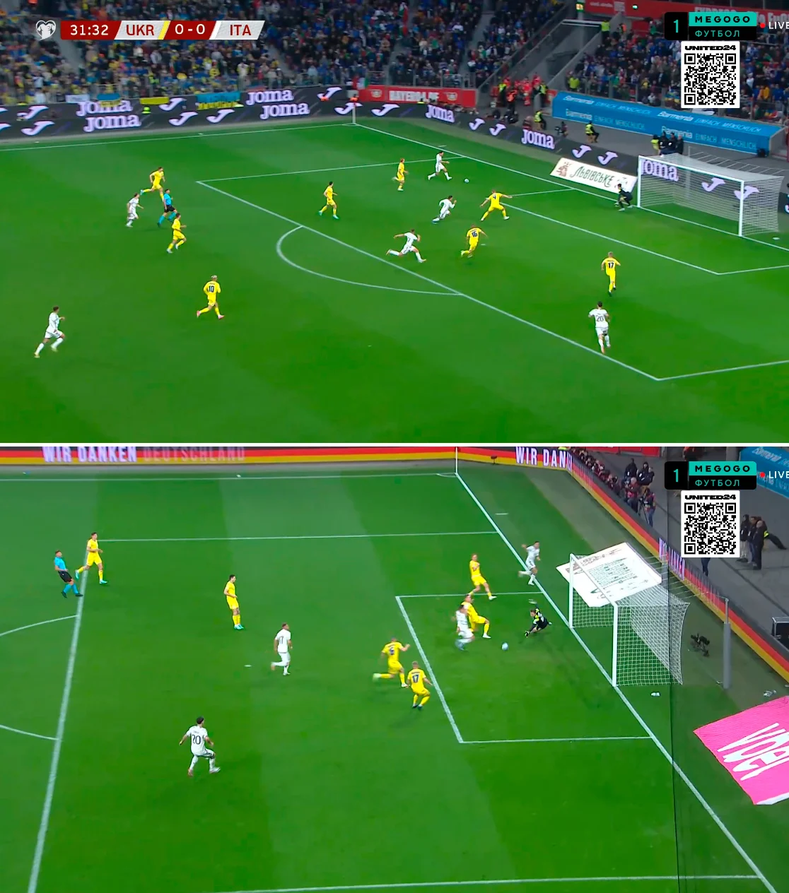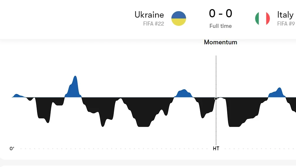 Статистика первого тайма оказалась удручающей. Италия держала мяч 64% времени, выиграла по ударам со счетом 10:2 и наиграла на 1,3 ожидаемых гола – против 0,10 у "сине-желтых". 21 из 35-ти единоборств на земле осталось за "Скуадрой", как и 8 из 11-ти воздушных дуэлей. Правда, значительная часть проигрышных единоборств Украины произошла на чужой половине.