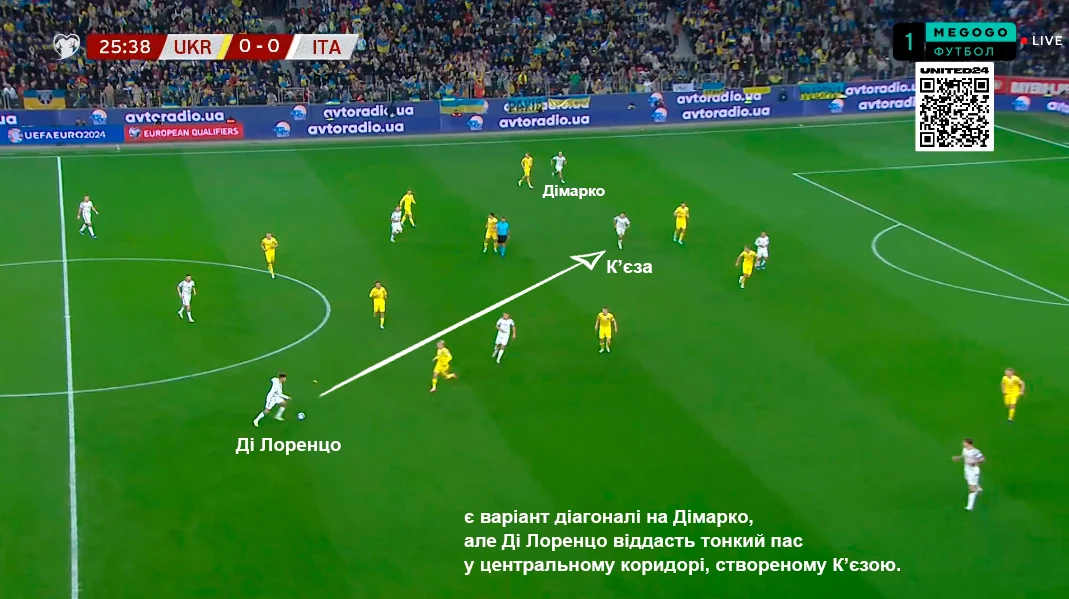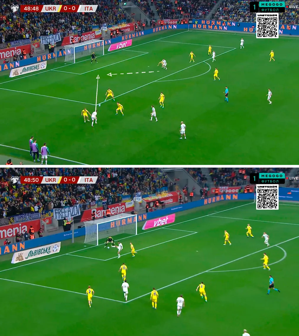 Тактика игры не изменилась. Ди Лоренцо заходил в опорную зону, Димарко прибегал в центральную зону перед штрафной, Кьези и Дзаньоло пытались создать изоляции, а вся модель была заточена на создание ширины. Из опорной зоны в штрафную площадку вбегали центрхавы.