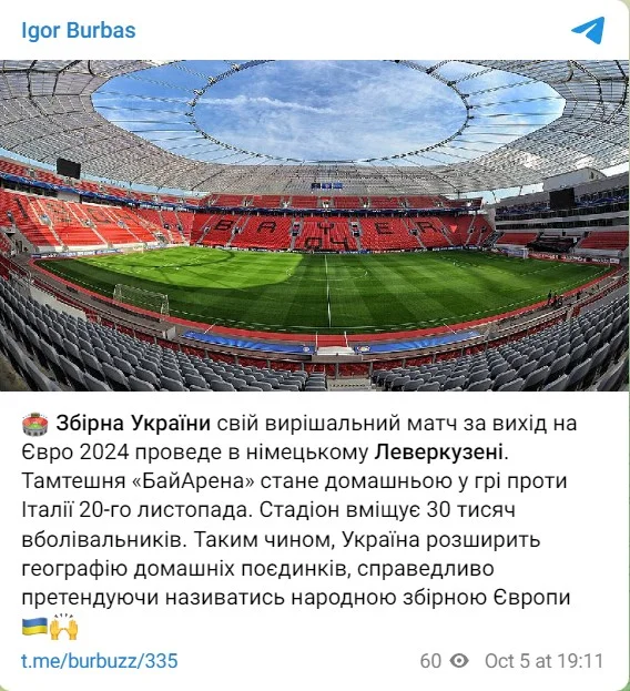 Украина проведет домашний поединок с Италией на Бай-Арене в Леверкузене, сообщает Бурбас в своем Telegram-канале.