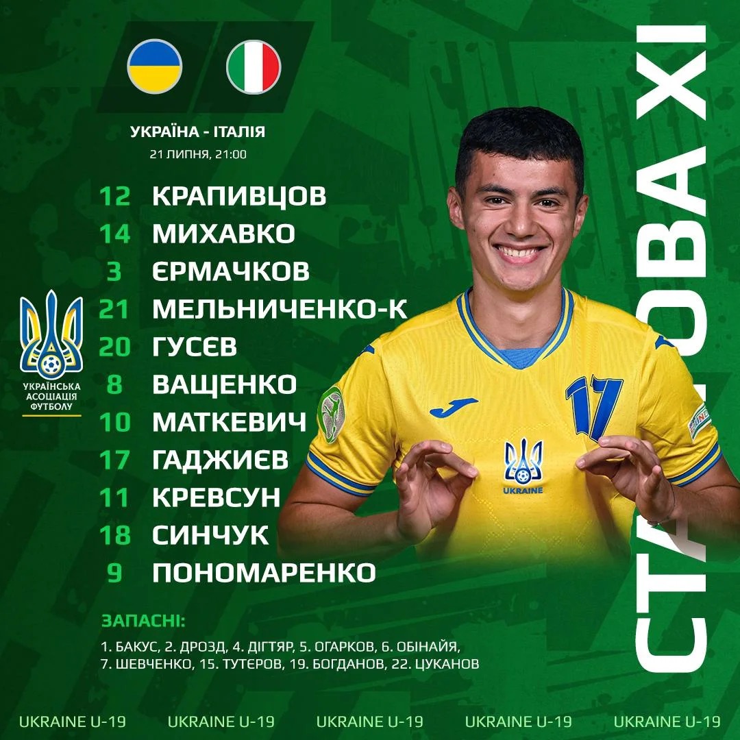 Стартовый состав сборной Украины U-19: Крапивцов, Михавко, Ермачков, Мельниченко, Гусев, Ващенко, Маткевич, Гаджиев, Кревсун, Синчук, Пономаренко.