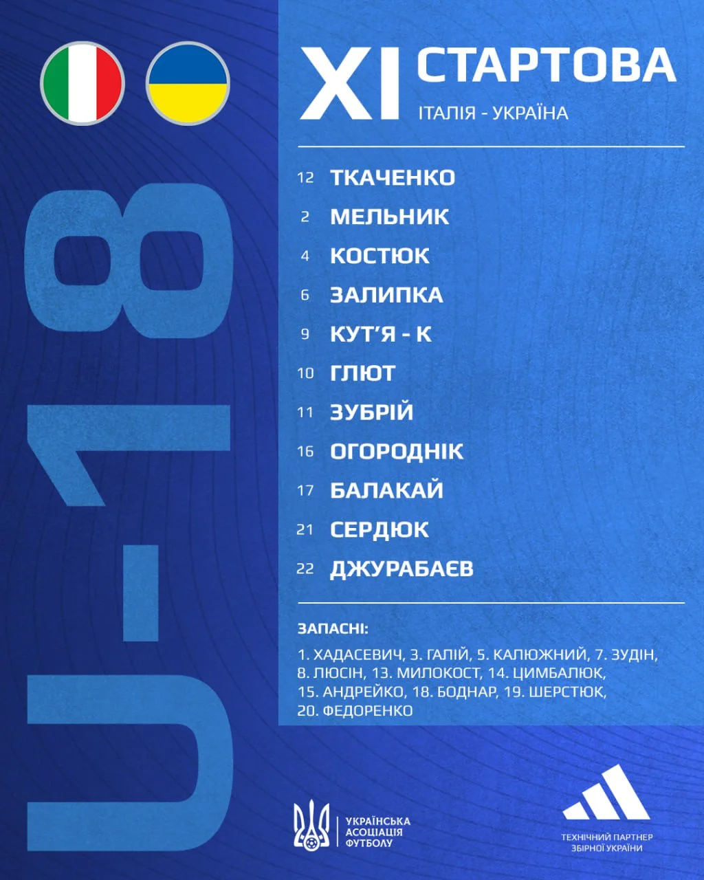 Стартовый состав сборной Украины: Ткаченко, Мельник, Костюк, Залипка, Кутья (к), Глют, Зубрий, Огородник, Балакай, Сердюк, Джурабаев.