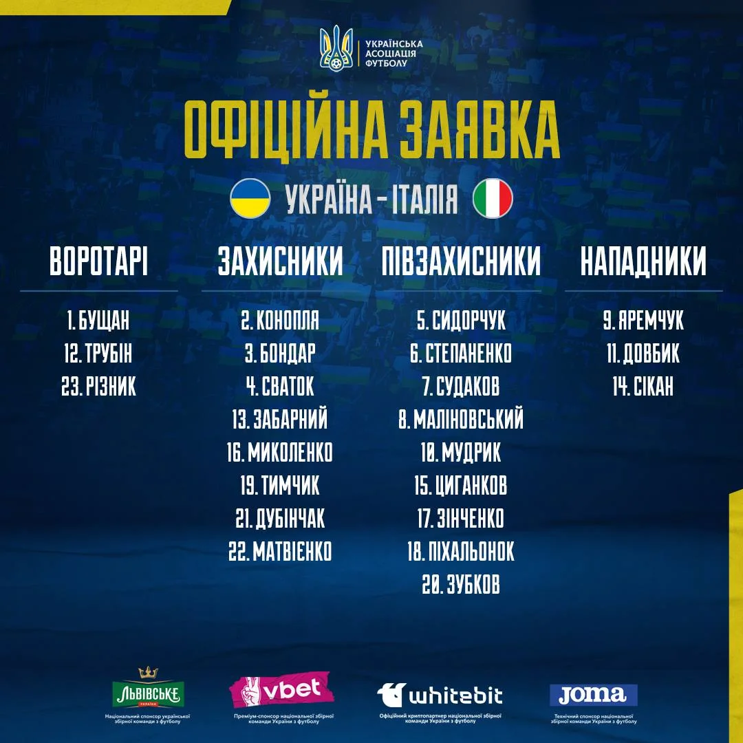 Заявка сборной Украины на матч с Италией: