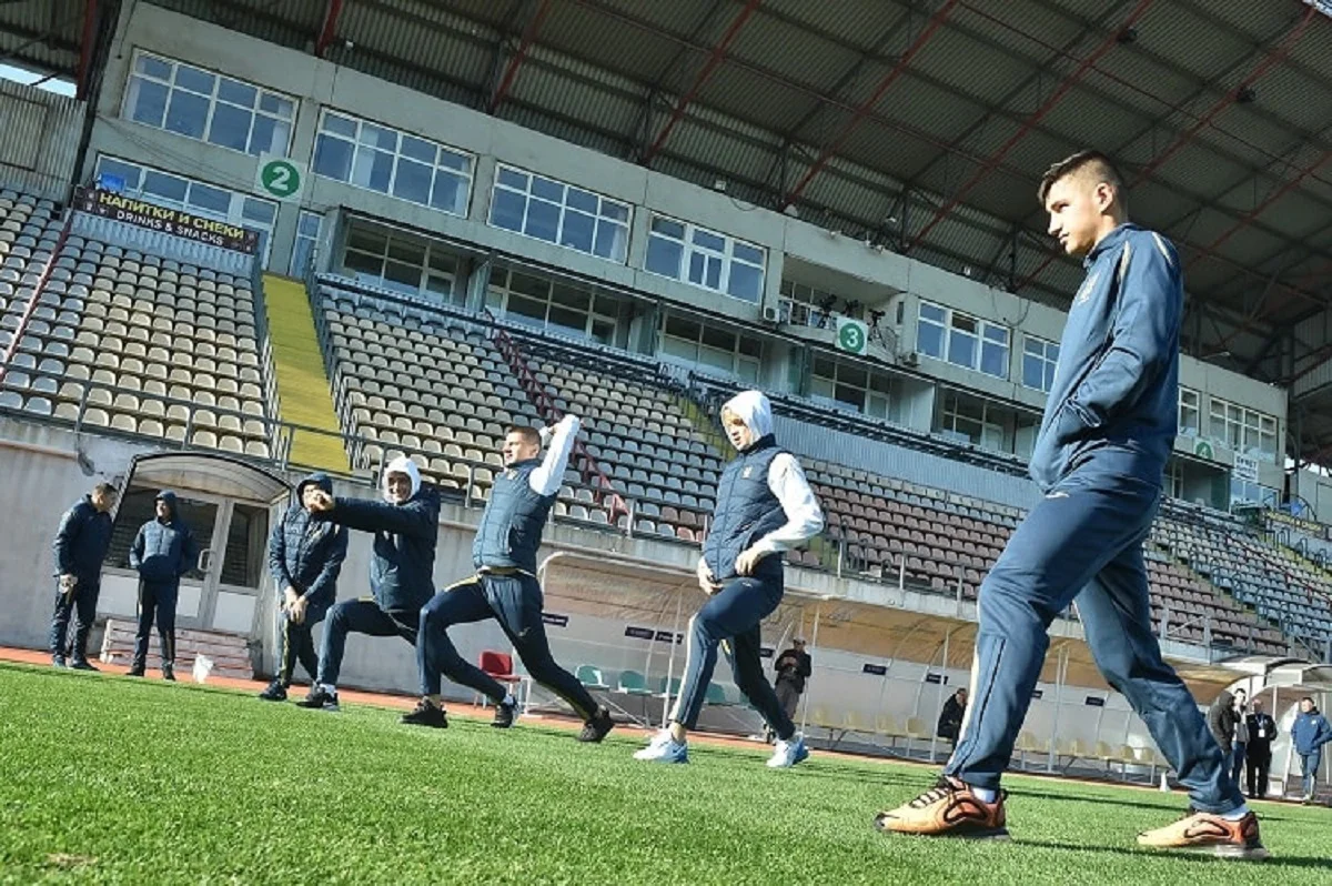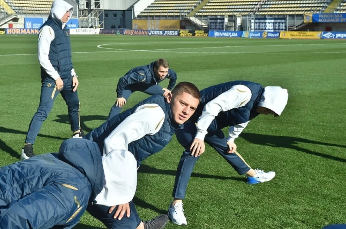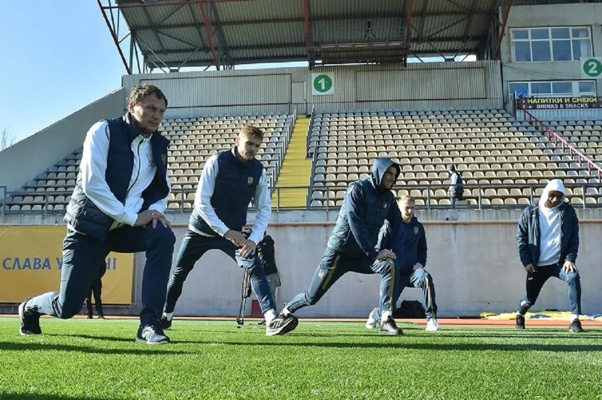 Футболисты протестировали качество газона и остались довольны его состоянием. Затем, под руководством тренера по физподготовке Ивана Баштового, игроки национальной сборной провели небольшую разминку.