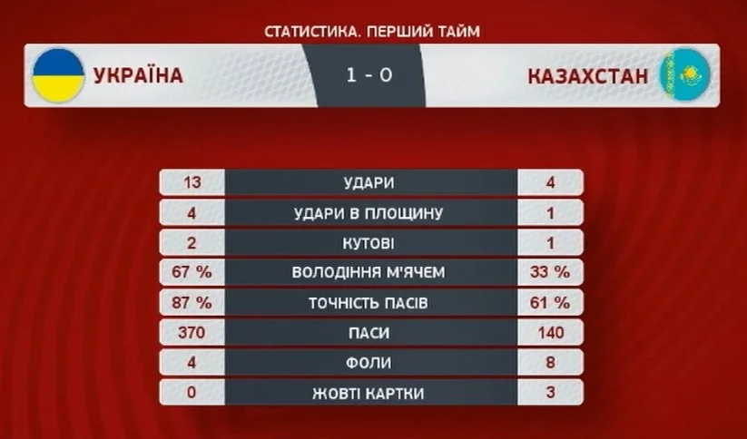 Первый удар на 6 минуте. Малиновскому грубо врезали (защитник Кайрата Алип получил заслуженную желтую), сам же Руслан исполнил стандарт – без проблем для голкипера. Сайт УЕФА традиционно не угадал со схемой команды Шевченко. На этот раз рисовали 5 защитников. но Зинченко играет в центре поля, а вовсе не левого защитника. Дикий брак украинцев (количество потерь на уровне казахов) на своей половине. Матвиенко едва не привез момент. Повезло, что соперник не очень высокого технического уровня и убежать далеко не сумел. Серия ударов гостей после очередного подарка защитника Шахтера. Зинченко который раз открывался в хорошей позиции, а Матвиенко не исполнил. Пошла обрезка и контратака. Отбились.