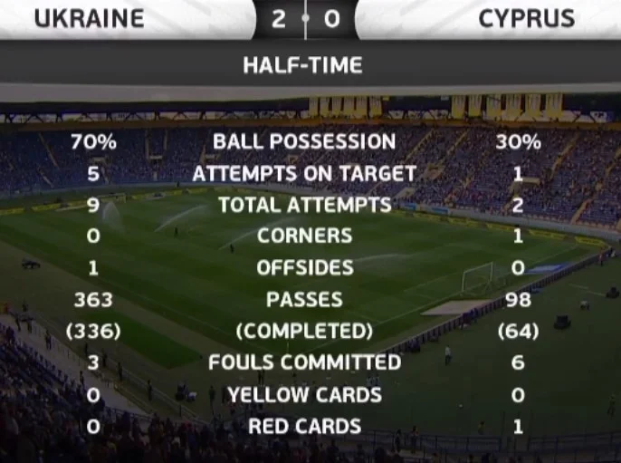 Гости верны своему новому стилю. Кипр глубоко сидит перед своей штрафной. У нас тотальный контроль мяча – более 80% времени. Малиновский завозился и допустил потерю на ровном месте, а мог ведь пробивать с удобной позиции. Зубков и Зинченко слева прекрасно чувствуют ситуацию на поле и быстро двигают мяч вперед. Идут постоянные острые передачи на Яремчука, снова едва не вышел Роман на свидание с Панаги, у которого слетела повязка со лба – очередная пауза. Шевченко что-то активно объясняет Соболю, запасные фулбеки работают не так креативно, как мы привыкли видеть.