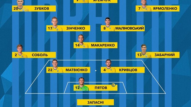 Стартовый состав сборной: 12. Андрей Пятов, 2. Эдуард Соболь, 4. Сергей Кривцов, 13. Илья Забарный, 22. Николай Матвиенко, 8. Руслан Малиновский, 14. Евгений Макаренко, 17. Александр Зинченко, 20. Александр Зубков, 7. Андрей Ярмоленко, 9. Роман Яремчук.