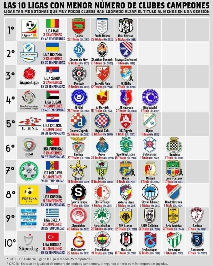 4 чемпионов имеют Судан и Хорватия, по 5 триумфаторов у Португалии, Молдовы и Чехии. К тому же португальская лига разыгрывалась 87 раз, однако только Бенфика, Порту, Спортинг, Белененсеш и Боавишта были коронованы.
