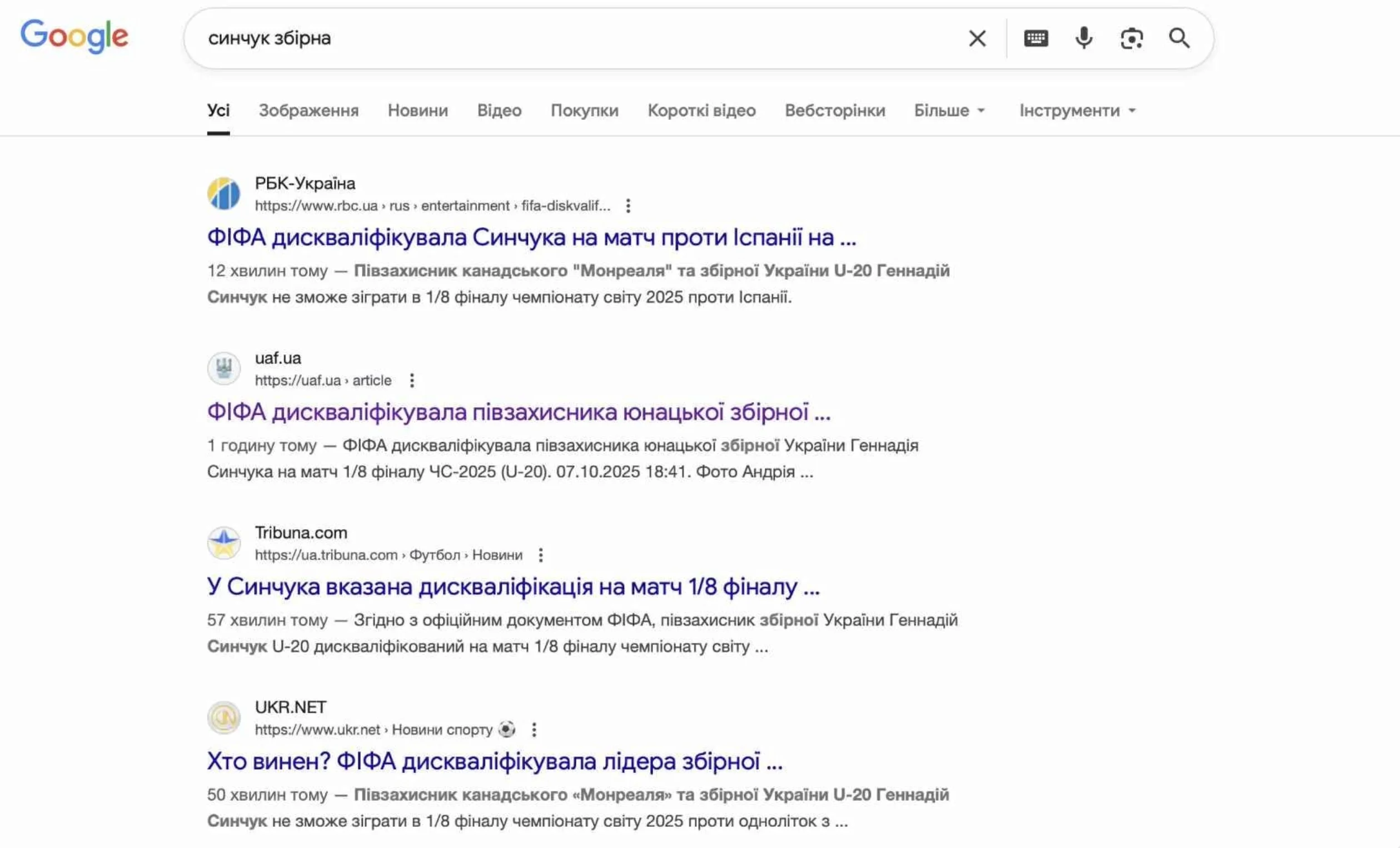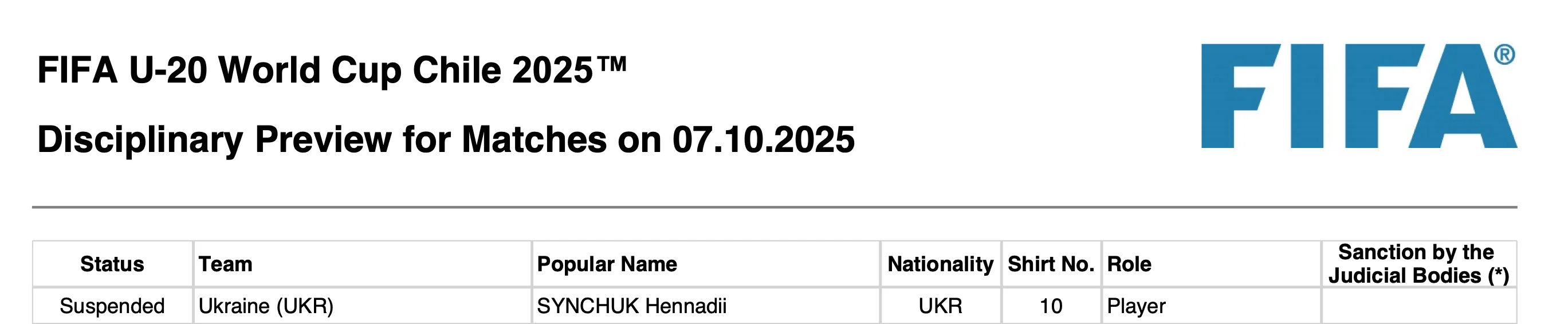 В официальном письме ФИФА к УАФ указано, что во время игры с Парагваем игрок находился в технической зоне, хотя на эту встречу он был дисквалифицирован. Такое нарушение регламента привело к дисквалификации Синчука на поединок с Испанией. Украинская сторона уже заявила о намерении обжаловать решение и добиться его отмены.