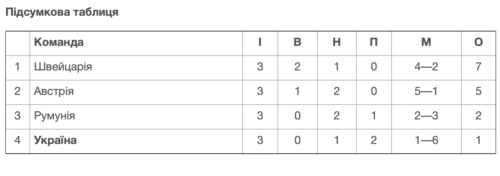 Итоговые места в группе определились так: Швейцария – 7 баллов, Австрия – 5, Румыния – 2, Украина – 1. Команда потеряла возможность остаться в Лиге А и продолжить борьбу за выход на чемпионат Европы, оказавшись в Лиге B в следующем цикле.
