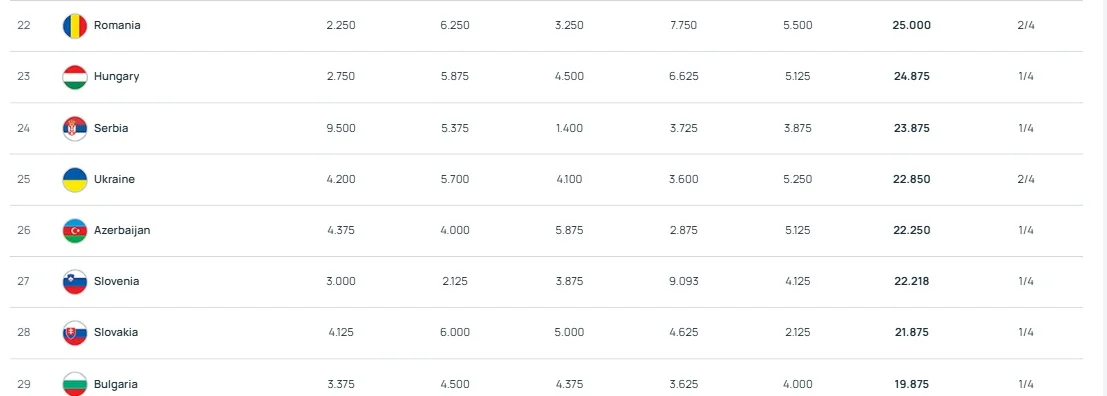 Хорватия, Сербия и Румыния находятся выше Украины в таблице коэффициентов, но отставание от них удалось сократить. Все эти страны на неделе получили по победе, однако не получили бонусов. Отставание Украины от них уменьшилось на 0,406 балла. Также удалось приблизиться к Венгрии, однако не так явно, ведь эта страна получила бонус за выход Ференцвароша в плей-офф Лиги Европы.