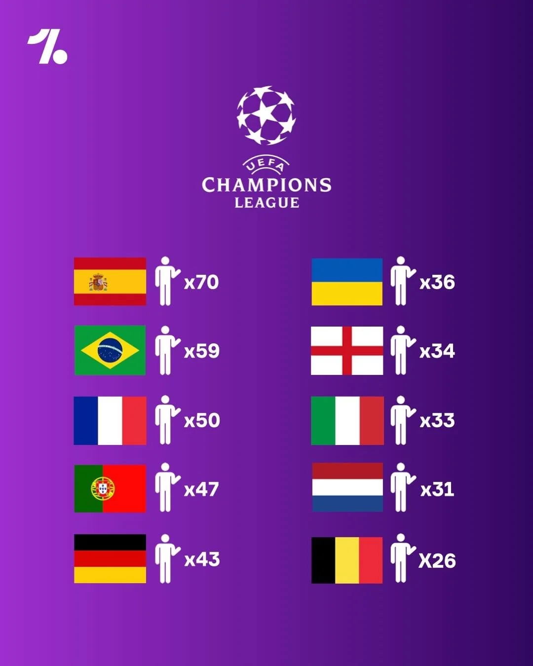 Украинцы – шестая по представительству нация в главном евротурнире, сообщает onefootball.