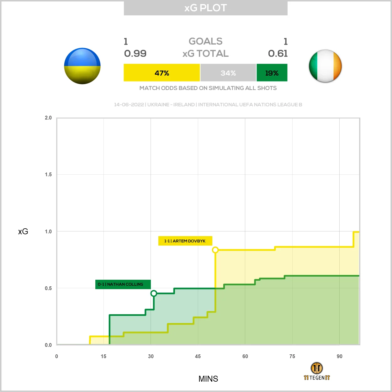 Когда было пространство, атака Украины начинала дышать. Когда его не возникало, то в штрафную входили бессистемно и стреляли на лёгкой истерике куда-нибудь – график xG ярко это доказывает. Были намёки на какие-либо перегрузы с вбеганием в свободную зону на противоположном фланге (момент Караваева), но регулярными такие эпизоды не стали.