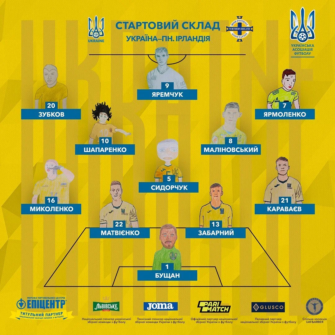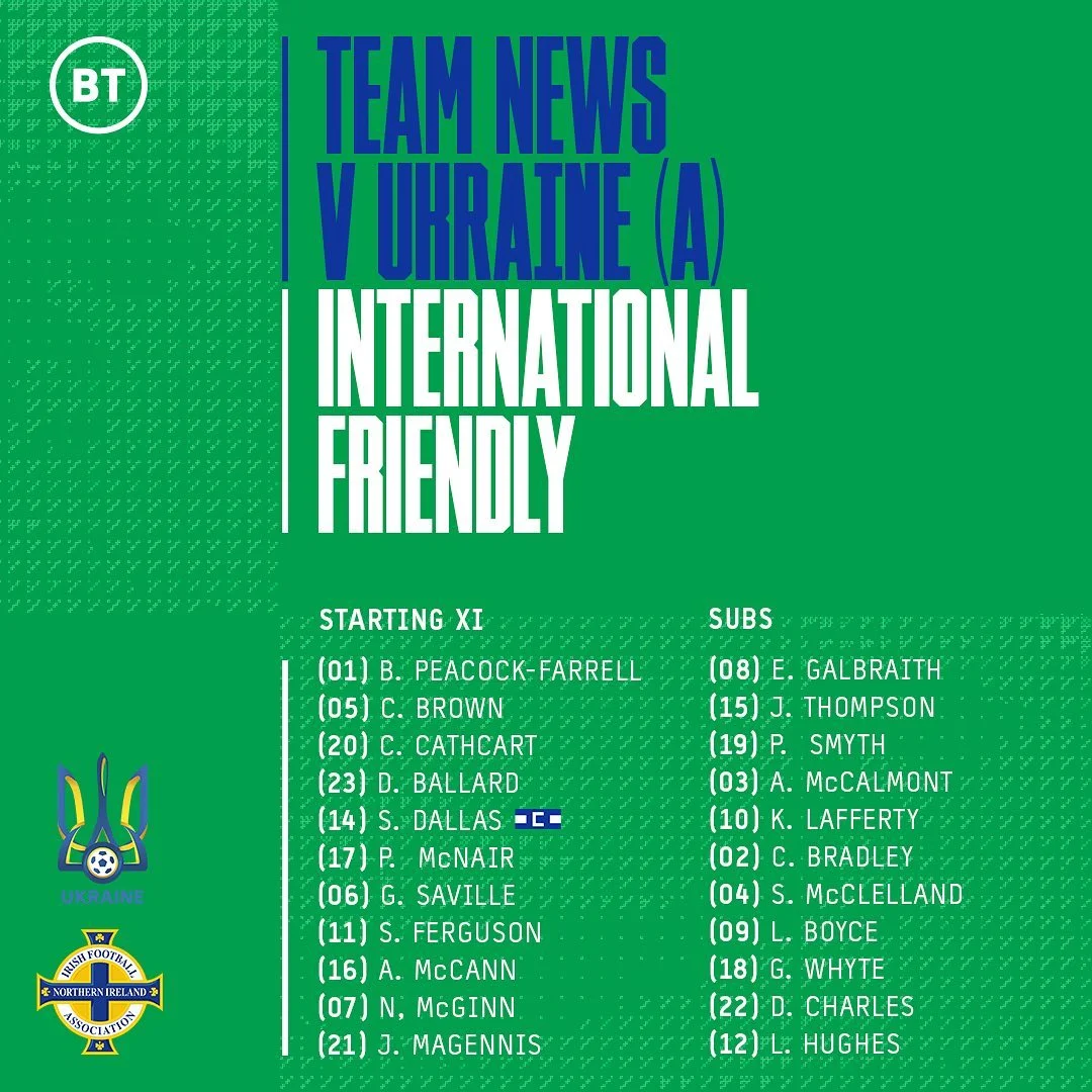 Шевченко сделал сразу 7 изменений в стартовом составе. Свои места после ничьей с Бахрейном сохранили лишь Матвиенко, Миколенко, Шапаренко и Зубков. С первых минут выходят сразу 6 игроков киевского Динамо и 4 легионера, тогда как Шахтер представлен одним Матвиенко. В составе гостей выделяется лишь звезда Лидса Стюарт Даллас. Капитан Северной Ирландии забил 8 голов и отдал 2 ассиста в АПЛ 2020/21, в частности, оформил сенсационный победный дубль на поле Манчестер Сити. Большинство других игроков представляют 2-3 дивизионы чемпионата Англии, а также элиту Шотландии. В воротах запасной голкипер борца за выживание в АПЛ (Пиккок-Фаррелл редко выступает за Бернли), в защите еще и игрок лондонского Арсенала U-23 Баллард.